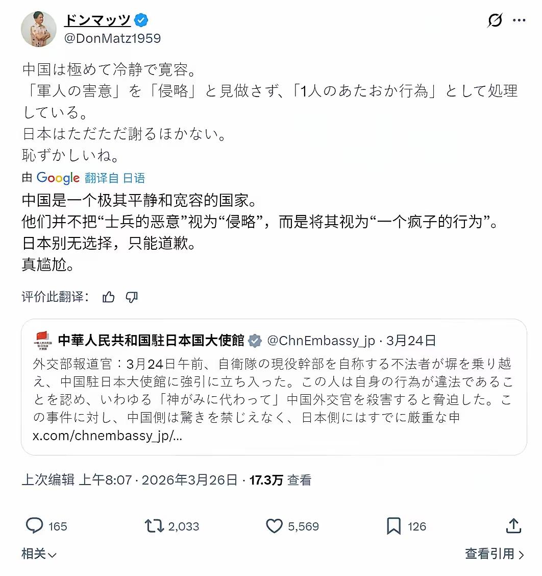 最近闹得沸沸扬扬的"日本军官擅闯中国使馆"一事,没有出现很多人预想中的激烈反弹,让不少日本网民自愧不如。 社交媒体上,一位日本网友的评论引发热议:"中国极尽冷静与宽容。没有把'军人的恶意'上升为'国家侵略',而是定性为'个别疯子的行为'来处理。对此,日本除了低头谢罪,别无选择。说真的,挺丢人的。" 评几句: 戳破话术:这根本不是"宽容",是降维打击。 日本右翼天天盼着中国暴怒,好给"中国威胁论"续费。结果呢?中方把事件摁死在"个案"层面,不升级、不接招、不给镜头。这套"冷处理"比抗议狠十倍——你演你的戏,我不陪你唱。 定性:谁在背后递剧本? 涉事军官隶属日本陆上自卫队情报部门,擅闯时机选在中日韩峰会前夕。说白了,这是日本政坛"短命鬼"们的老把戏:国内支持率崩盘,就往外扔火星子。岸田文雄内阁支持率跌破20%,不制造点"外部紧张",怎么转移视线? 动机:泛安全化的生意经。 日本一边喊"对话窗口",一边把自卫队往西南诸岛堆。2024年防卫预算7.95万亿日元,连创新高。他们嘴上谈和平,现实却在买战斧导弹、改航母、拉北约亚太化。这种精神分裂式的表演,骗得了选民,骗不了历史。 后果:玩火的人不怕烫? 冲绳美军基地噪音诉讼堆积如山,福岛核污染水排海把渔业招牌砸烂。再这么折腾,东亚产业链断裂的第一块多米诺,就是日本汽车出口的命根子。2023年丰田在华销量下滑1.7%,本田跌10.1%。数据比外交辞令诚实多了。 揭穿:谁在丢人? 日本网友羞愧的不是这次事件,是自家政府87年前那套"士兵失踪"的军国主义惯性。1937年卢沟桥,借口挑事全面侵华;2024年闯使馆,想复刻剧本却没对手配合。时代变了,中国不是当年的中国,日本右翼的脑子却还停在昭和。 归根结底: 大国博弈的火候,不在嗓门在分寸。把恶意摁死在个案层面,不让它发酵成民族仇恨,这才是真正的战略定力。日本网友的"丢人"感慨,反证了这种定力的稀缺价值——不是谁都有底气选择冷静。 他们真以为中国会跳脚?还是盼着中国跳脚?谁在得利?你站哪一边?说说理由。