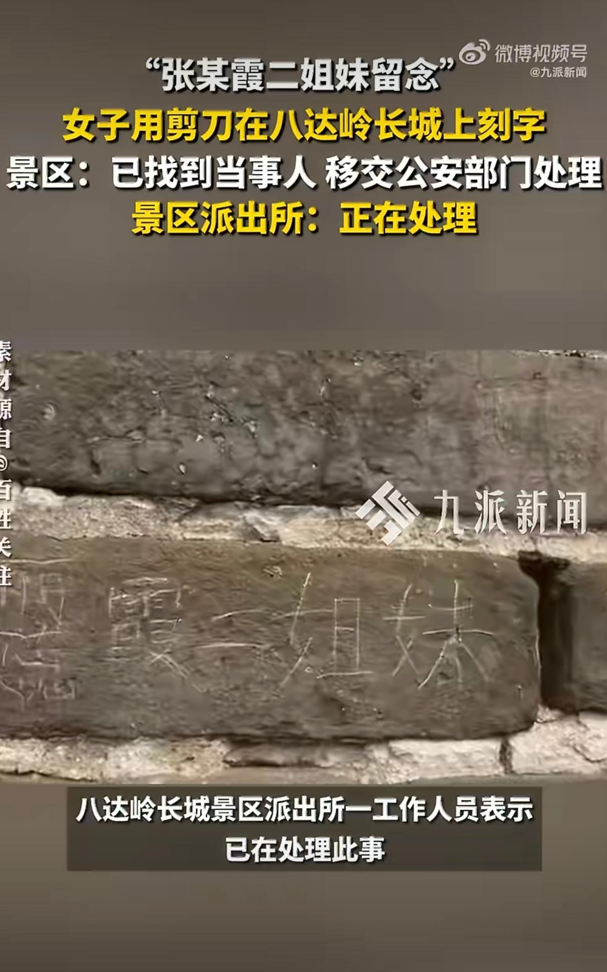 北京,女子去旅游,发现一女游客用剪刀在砖石上刻字,女游客的同伴没制止,还给她拍照留念,女子看得很气愤,想上前阻止又怕争执,她反手一个操作,女游客结局令人解气! 长城上那把大剪刀,是怎么被“制服”的两把剪刀,一把明晃晃的钢刃,正对着八达岭长城一块有几百岁“高龄”的城砖。握剪子的是个中年大姐,旁边站着她的同伴,举着手机,一脸得意“姐,这字刻得真清楚,赶紧拍下来发朋友圈,纪念意义多大啊!” 这是2024年3月23日下午一点多的事儿,地点在北八楼到北九楼那段。周围游客乌泱泱的,可这俩人完全视若无睹。剪刀“滋滋”划过青砖,灰土飞溅,等她们收手时,砖面上赫然多了“张某霞二姐妹留念”几个大字。 你能想象吗?那可是明代留下的老砖头,经得住几百年的风霜雨雪,却没防住一把剪刀。旁边有个女游客,把这出闹剧从头看到尾。她火气“噌”上来了,拳头捏得紧紧的,真想把那剪刀夺过来。但她马上冷静下来:对方两个人,自己一个,万一吵起来吃亏的是自己。 怎么办?硬碰硬不行,但不等于什么都不做。她悄悄掏出手机,打开录像,把那大姐刻字的全过程、那同伴起哄的嘴脸,一帧不漏地拍了下来。整个过程隐蔽得像在做地下工作,就为了把证据做实。 等那俩人拍完“大作”,心满意足准备撤离时,女游客一个箭步冲到景区巡逻队面前,把视频往工作人员手里一塞:“她们刚才在那儿刻字毁文物呢,我全程录下来了。” 巡逻队火速出击,把人截住。刚开始这俩还想抵赖“就是随手划拉两下,哪知道这么严重?”可铁证摆在眼前,任何辩解都苍白得像那张刻字的纸。 案子移交到延庆警方,处理结果是行政拘留外加罚款,一分不少。根据《治安管理处罚法》,故意损毁国家级文物,情节严重的,就是这个后果。 这事儿还有个后续,景区检票口的大屏幕会滚动播放被处罚的游客信息,黑名单弹窗提醒。这些年为了拦住“不自觉”的人,景区买票弹窗、警示牌、大喇叭,什么招都用上了。 但说实话,最管用的可能还是那部手机。那个“手欠”的大姐以为长城是个可以随便留念的本子,没想到自己反倒成了被记录的对象。现在出门旅游的人,手里都举着手机。镜头对准的不只是风景,有时候也包括那些自以为没人看见的龌龊事。这种“透明监督网”,大概是那些想刻字留念的人从来没算进去的成本。
