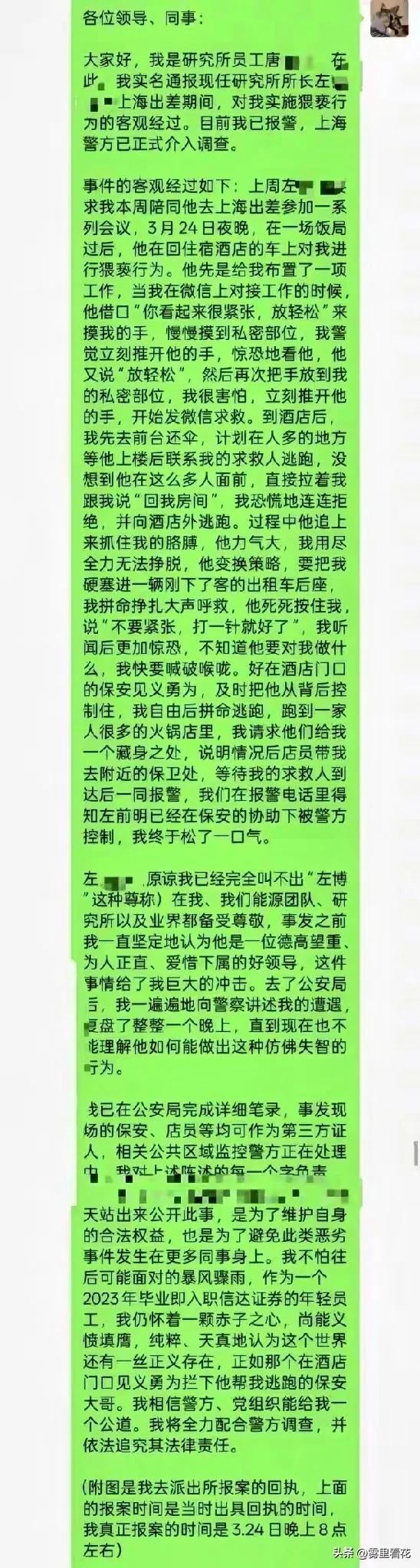 她叫唐婵玉,名校履历配高颜值,眉清目秀肤白貌美,没想到姣好的容貌却引来领导的垂涎。 在出差期间,领导硬要给她“打针”。打什么针?领导会医术?而她不畏强权,大喊救命,多亏酒店保安阻止了领导,她于凌晨报警。领导被刑拘。 警察应该第一时间搜查他身上或者行李是否有针管,是否有毒品或者麻醉剂,切不可大意。 唐小姐颜值实力双在线,难免让人动心。但再惊艳也得守好分寸,边界感不能丢。唐小姐勇气可嘉,做了别人敢怒不敢言的事。职场女性都应该向她学习。