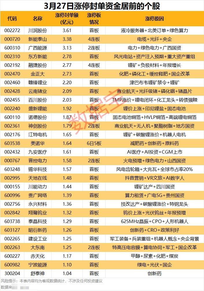 3月27日涨停封单资金解析📊 3月27日,涨停封单资金高度集中于算力、锂矿、绿电三大主线,同时叠加国企改革、商业航天等题材,市场情绪活跃。 算力与算电协同是封单最强方向:川润股份以3.61亿封单居首,液冷服务器+绿色算力逻辑获资金强认可;新能泰山、广西能源、晋控电力等绿电+国资标的封单靠前,算电协同主线持续发酵。 锂矿板块受供给收缩催化,封单资金密集:赣锋锂业、融捷股份、盛新锂能等多股封单超1.9亿,津巴布韦锂矿禁令引发供需预期变化,资金抱团锂矿及锂电材料标的。 题材与创新药表现活跃:神剑股份、云南锗业凭借商业航天+小金属概念获大额封单;美诺华、舒泰神等创新药标的也跻身榜单,减肥药、AI医疗等细分方向获资金追捧。 整体来看,封单资金紧扣市场主线,高景气赛道与政策利好题材形成共振,短线交易情绪高涨。