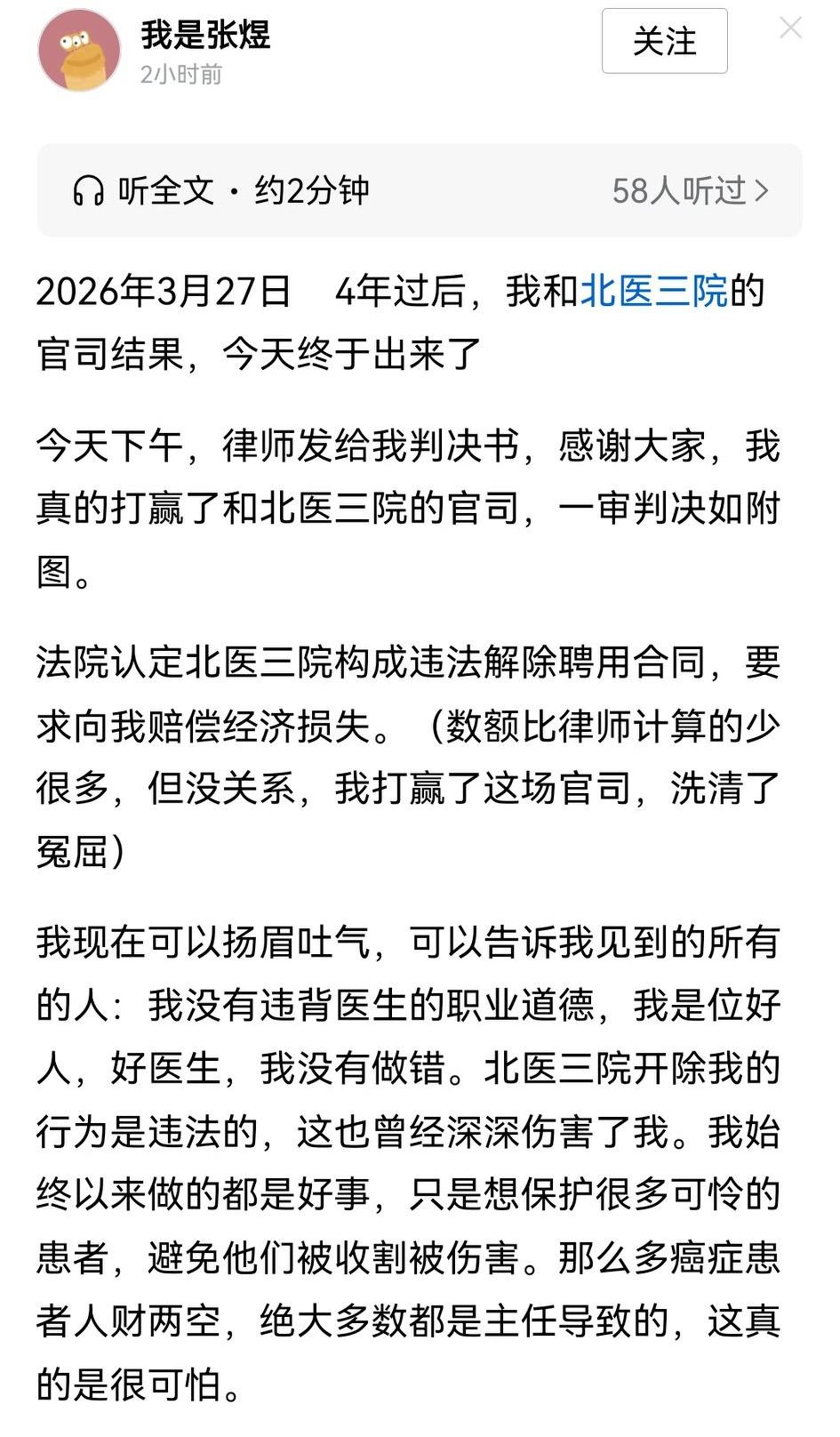 通报个喜讯,原北医三院的医生张煜,就是举报某些人违规治疗癌症的那个, 状告违法解聘的北医三院的官司,今天胜诉了! 支持良心的张医生!