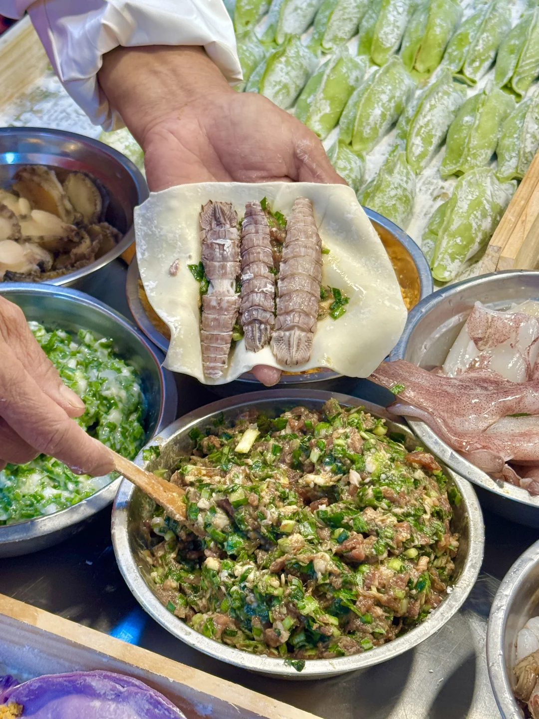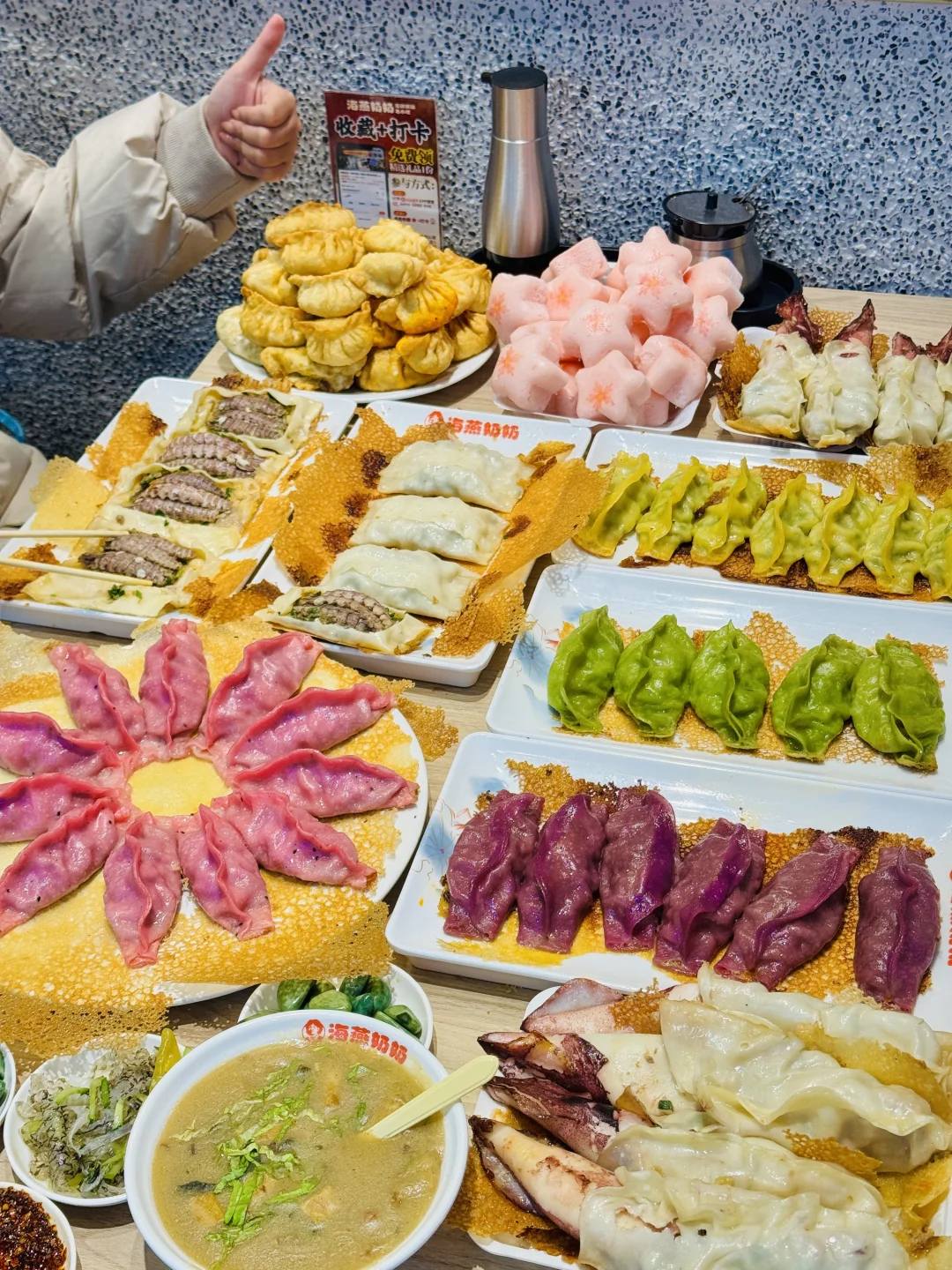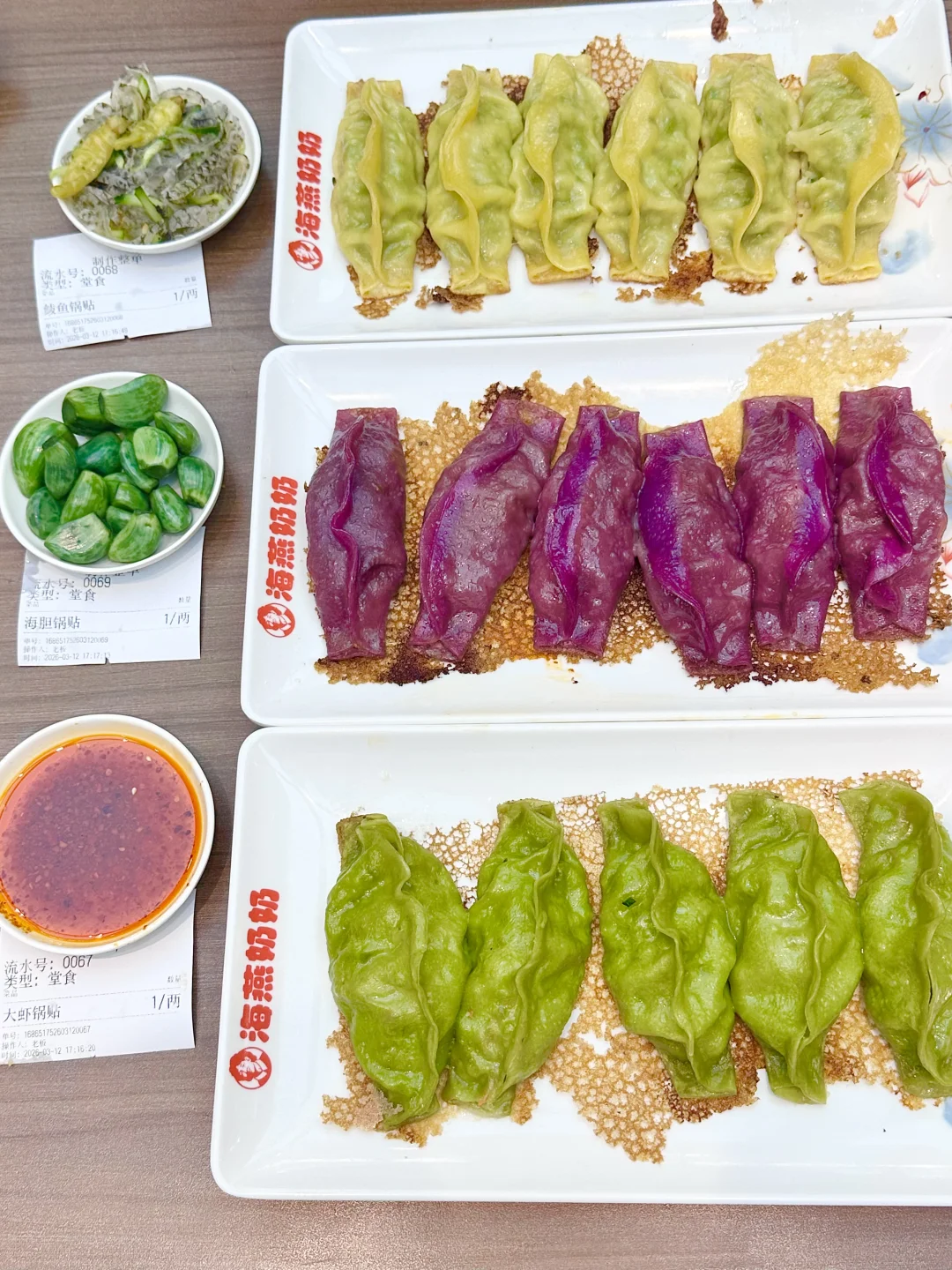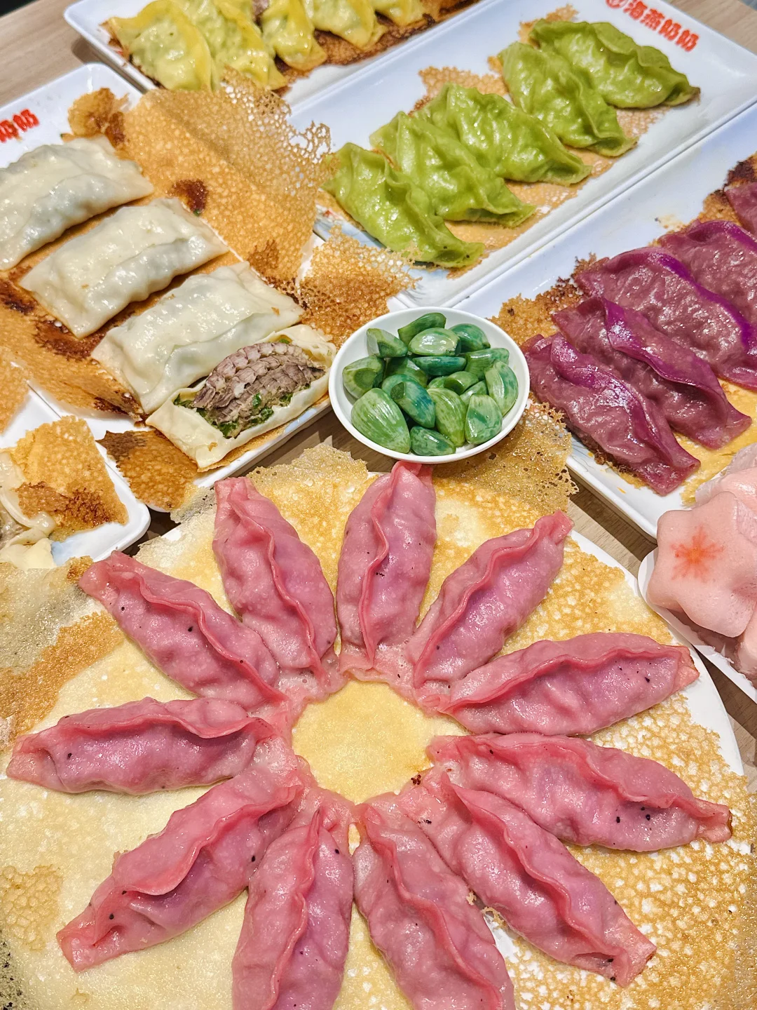 青岛的美食是真的多呀!巨巨巨巨多口味的海鲜锅贴我还是这一次见! 到底是谁发明的大笔管锅贴,一整只大鱿鱼🦑直接包里头,还有纯海胆锅贴,琵琶虾锅贴,都是新鲜食材现包现煎! 外皮煎的黄金酥脆,再搭配店里的腊八蒜和油泼辣子,真的吃到爽~ 来青岛的真心建议来尝尝! 📍:海燕奶奶