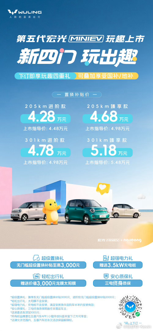 转眼五菱宏光MINIEV已经到了第五代,这次新款一共4个版本:205km进阶、205km臻享、301km进阶和301km臻享。目前置换补贴价:4.28万-5.18万元。