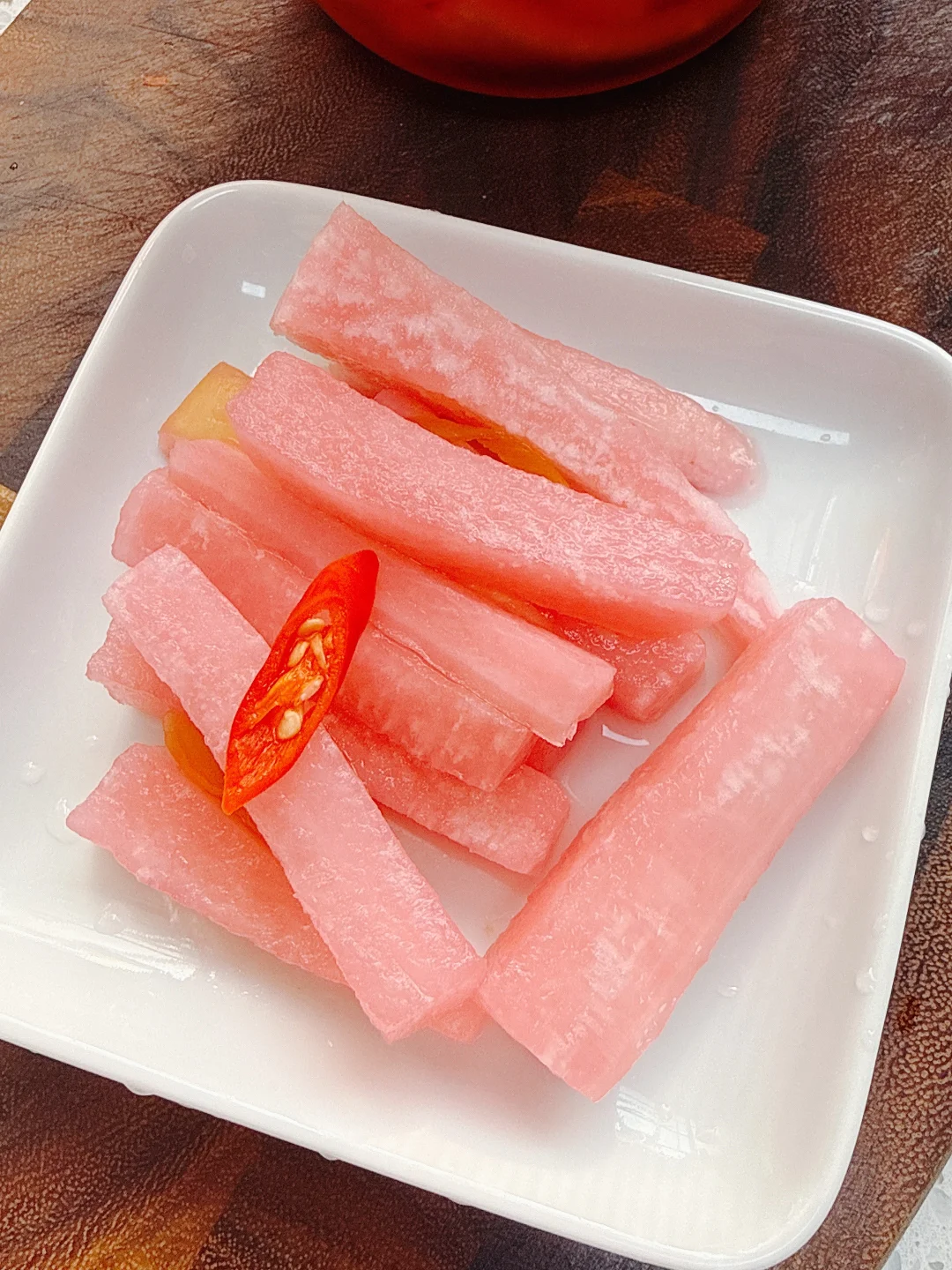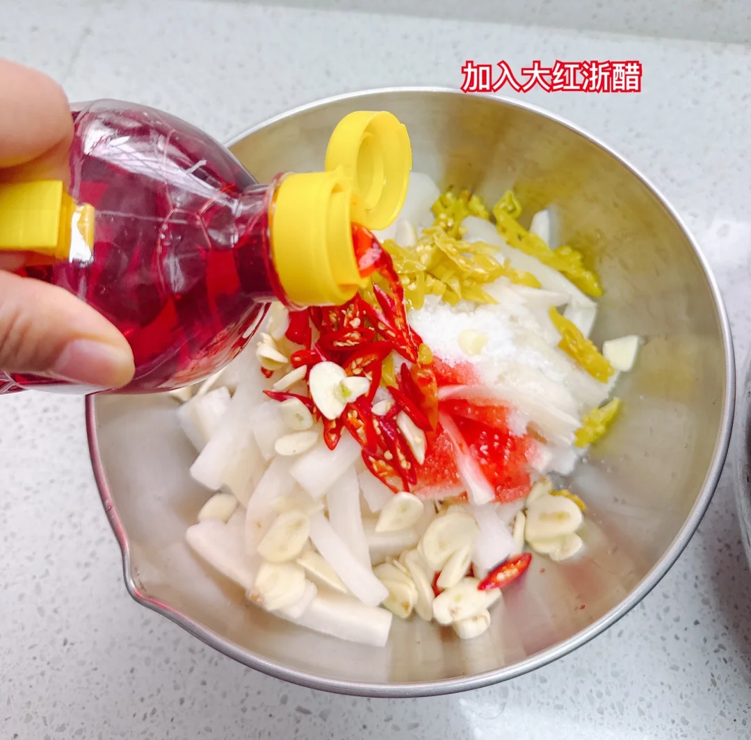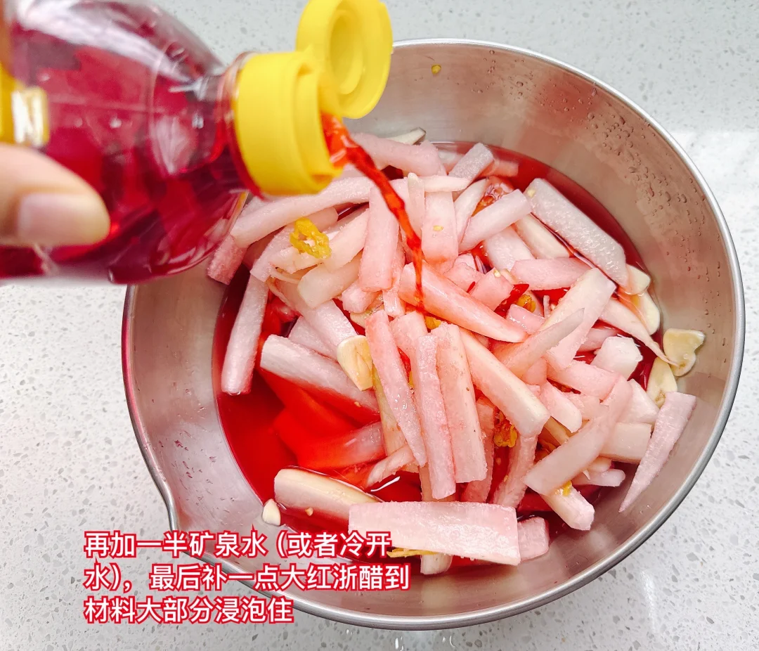 大红浙醋除了泡萝卜还可以泡其他蔬菜,也可以代替日常用的醋,尤其适合配海鲜。不用担心大红浙醋的红色,我用的这个的红色来自萝卜里提取的自然的萝卜红,有的大红浙醋的红色是发酵时加入了红曲米,红色是红曲米的颜色,所以都是很自然的材料,可以放心用。