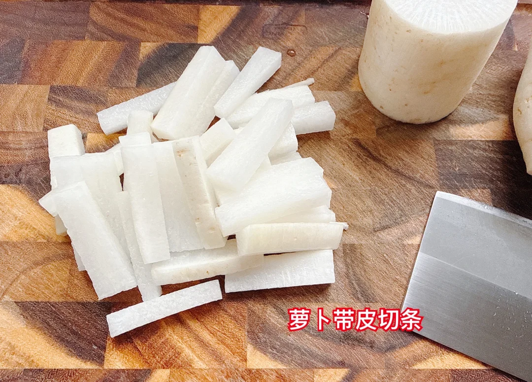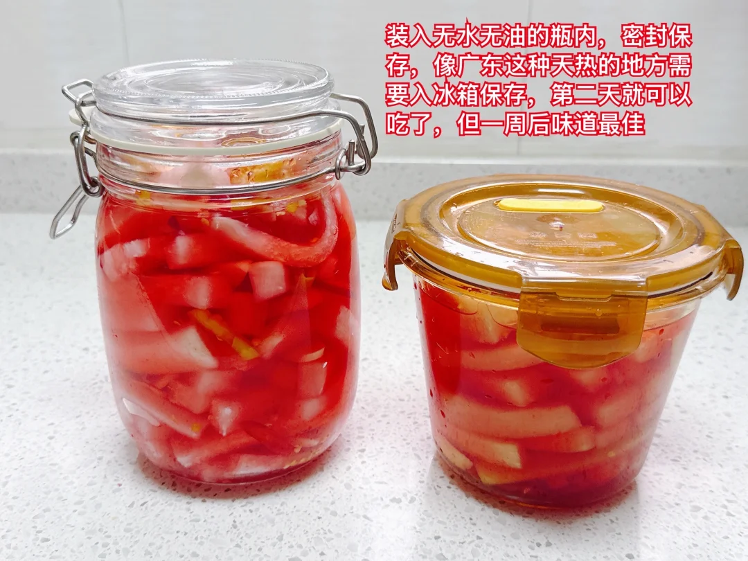 1、白萝卜洗净,擦干水分,带皮切成条,放入无水无油的容器。