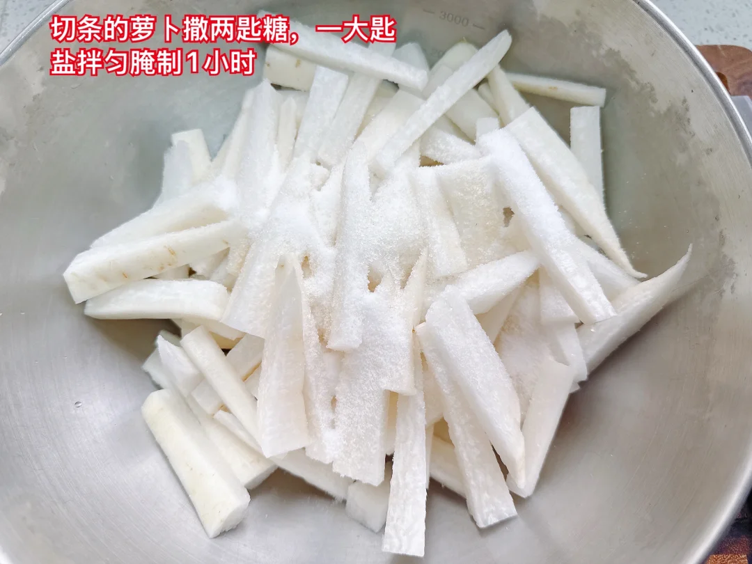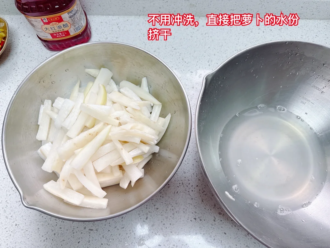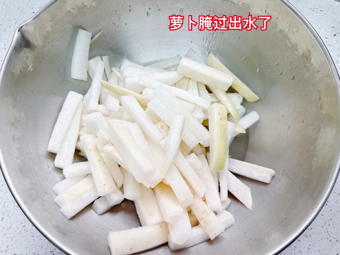 3、一小时后萝卜腌出水了,不需要清洗,直接把萝卜挤干水分。