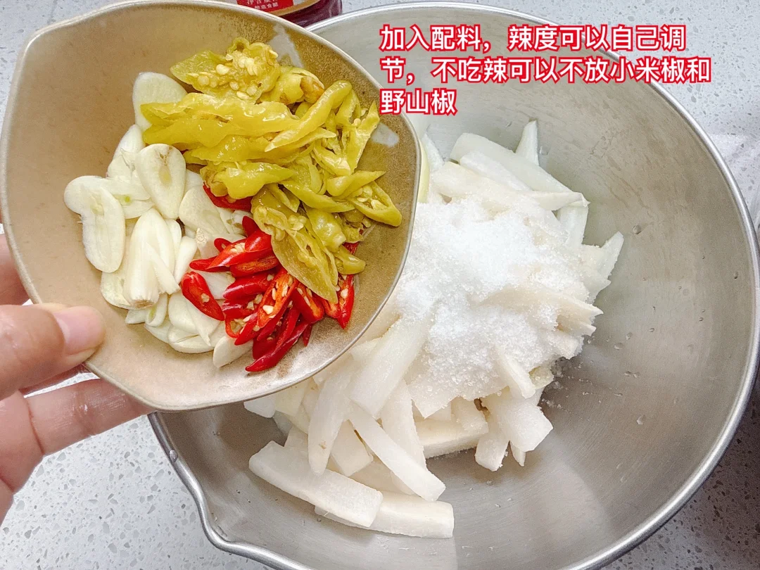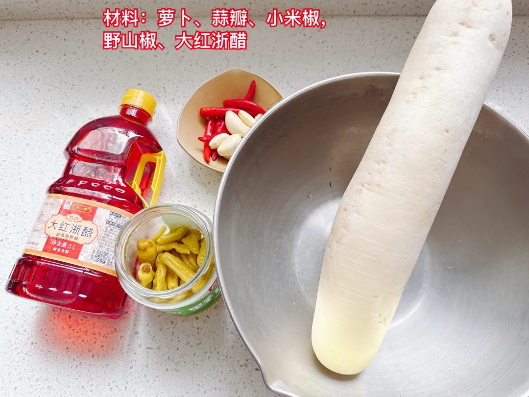 准备材料:白萝卜1根、野山椒适量、小米椒2根、蒜瓣4、5瓣、盐、糖、大红浙醋各适量,矿泉水或者晾凉的开水适量
