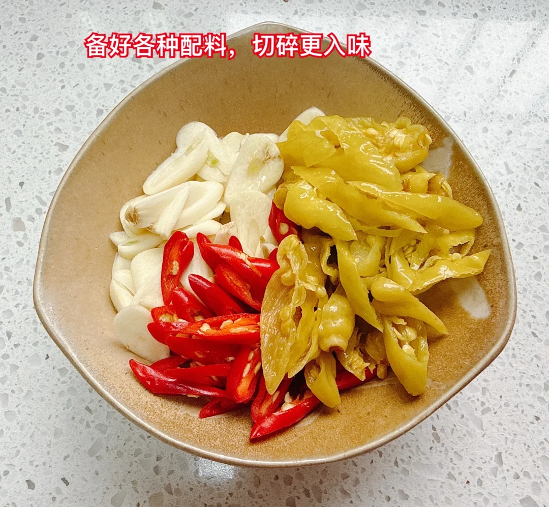 5、加入蒜片、野山椒、小米椒,加入大红浙醋和适量矿泉水。
