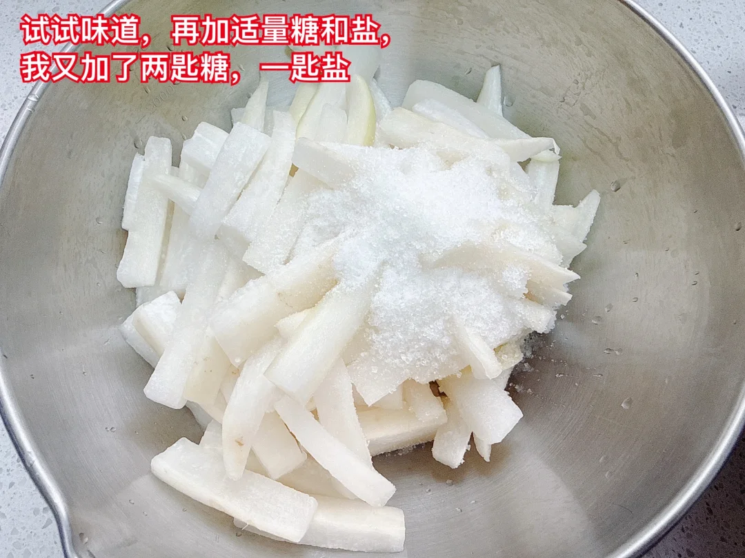 4、再略加糖和盐,可以根据自己的喜好来放,喜欢甜酸口就糖多一点,喜欢咸酸微微甜就盐多一点糖少一点。