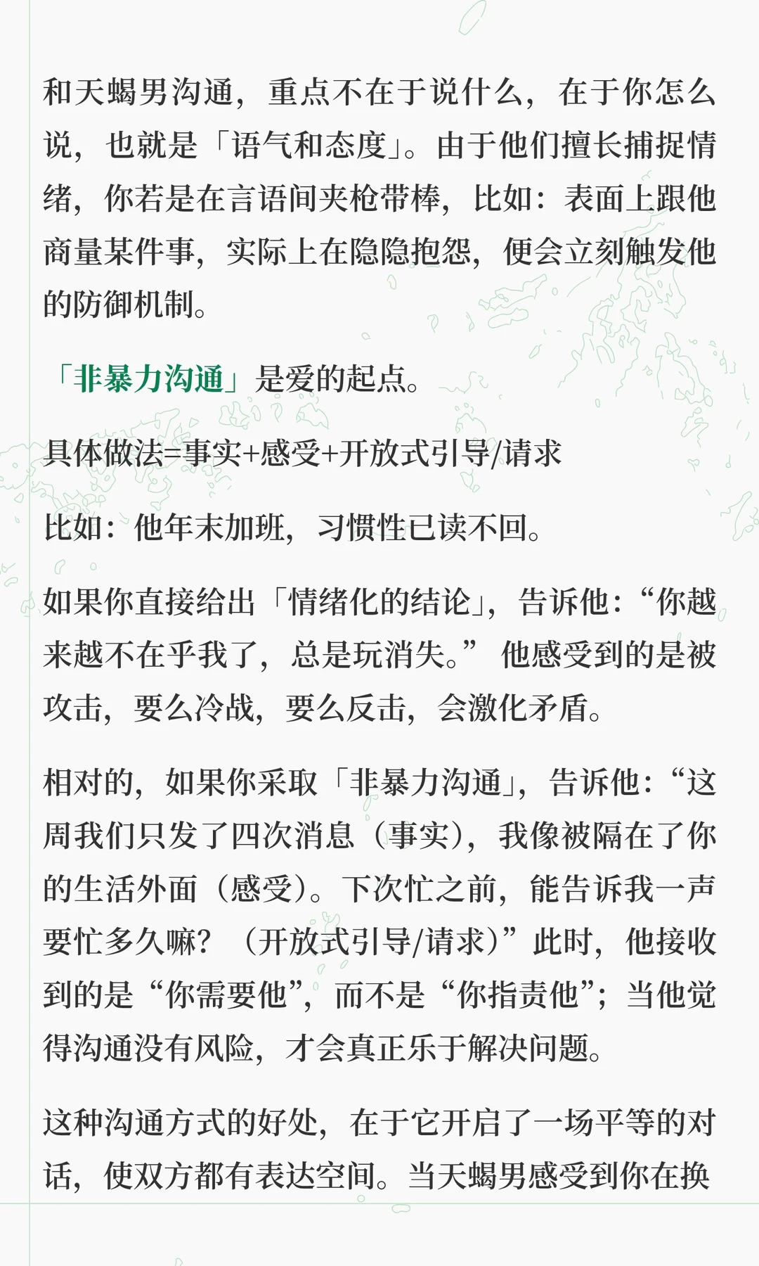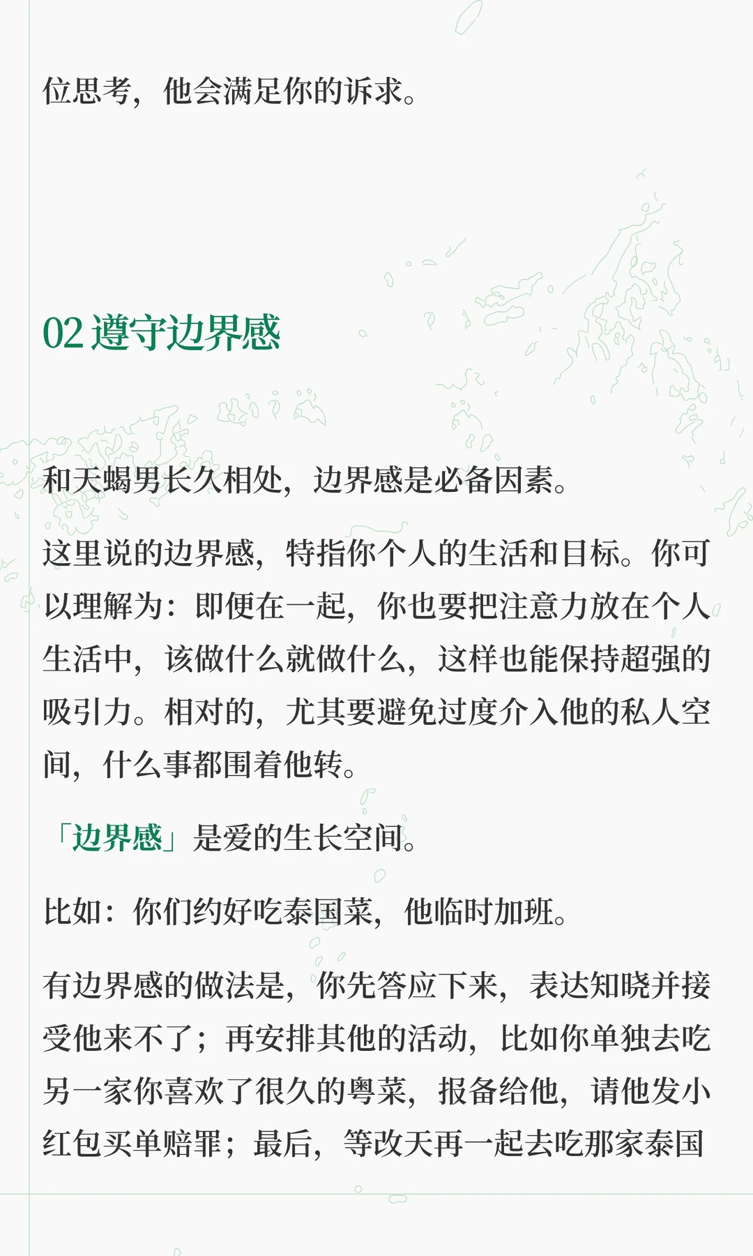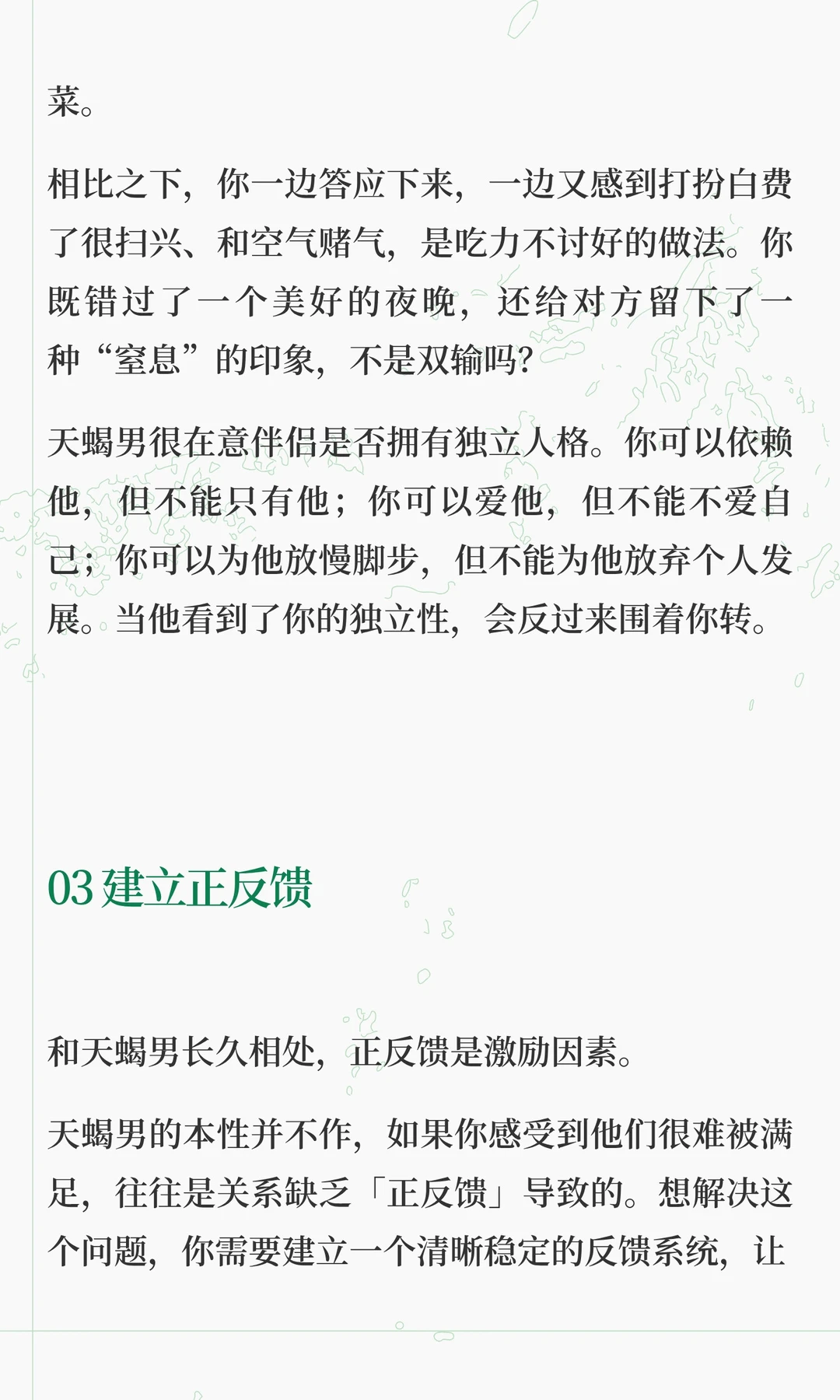 和天蝎男感情长久不靠忍耐。凡是能和天蝎相处多年的人,都是「做自己」的高手。这些人身上没有想象中的讨好感,反而有着很强的主体性,很擅长做自己。