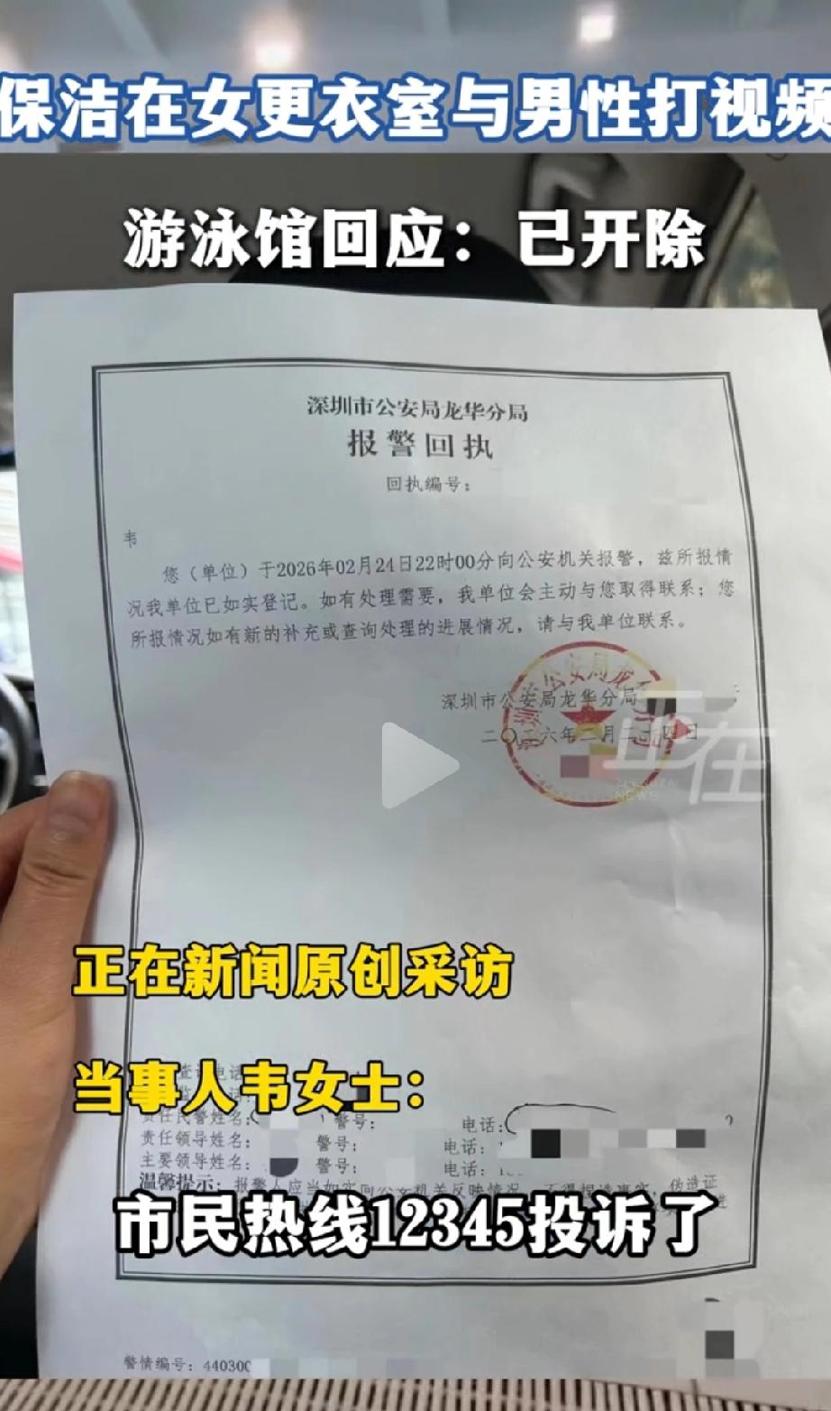 太离谱了!深圳,某游泳馆女更衣室内,本是私密极好的地方,万万没想到,保洁人员竟在浴室和更衣室之间的无遮挡区域,与男性视频通话,声音大且持续近十分钟 。顾客发现后上前制止,保洁却拒不承认,僵持近一分钟后,电话里再次传来男性声音才挂断 。 据韦女士说,2月24日晚9点半左右,刚游完泳,在浴室洗澡时就听见外面有个男人的声音,忽远忽近、特别大声 。 她以为是自己听错了,女更衣室怎么会有男人说话呢? 十分钟后,韦女士裹着浴巾走出浴室,眼前的一幕让她瞬间炸毛——一名保洁阿姨正举着手机,在更衣室和浴室之间的过道上,和一个男人视频聊天! 这两个区域只隔了两三米,中间连个帘子都没有,完全是敞开的 ! 韦女士赶紧上前:"阿姨,你怎么能在这里视频呢?这里都是换衣服的女顾客啊!" 可保洁阿姨却一口咬定:"我没视频,就是普通打电话!" 韦女士和其他几个顾客都围了过来,大家都听到了电话里男人的声音,可保洁就是不承认,双方就这样僵了快一分钟。 突然,电话那头又传来一声男人的问话,保洁这才慌了神,赶紧挂断了视频。 "报警!必须报警!"韦女士和其他顾客都觉得太过分了,这是在侵犯大家的隐私啊! 到了派出所监控室,面对铁证,保洁阿姨终于低下头,承认自己确实是在和男性视频通话。 评论区网友炸了! "这也太离谱了!女更衣室是私密空间,怎么能随便和男人视频?这跟直播有啥区别?" "最气人的是她还不承认!被抓包了才肯认,这是明知故犯啊!" "开除就完事了?游泳馆也有责任吧!怎么管理的?" "女更衣室、浴室这种地方,是咱们最隐私的空间,脱衣服、换衣服,都是最私密的时刻 。 保洁阿姨拿着手机在这里视频,等于把所有顾客的隐私都暴露给了屏幕那头的陌生男人,这跟当众扒衣服有啥区别? 更让人气愤的是,游泳馆只开除了保洁,却连个书面道歉都不肯给韦女士。这是觉得顾客的隐私不值钱吗?顾客花了钱来消费,难道连最基本的隐私保障都得不到? 这件事绝不是小事,它戳中了所有人的痛点——隐私安全。《民法典》明确规定,更衣室、浴室这种私密空间,任何人都不能随便拍摄、窥视 。 游泳馆作为经营者,对顾客的隐私权负有法定的安全保障义务,不能只在出事了才想着开除员工,更要从根源上做好管理 。 别把顾客的隐私当儿戏!也希望韦女士能早日拿到那份应得的书面道歉,让我们看到对隐私的尊重,对规则的敬畏。 最后想问问大家:如果你遇到这种情况,会怎么做?你觉得游泳馆该不该给韦女士书面道歉?评论区聊聊你的看法!