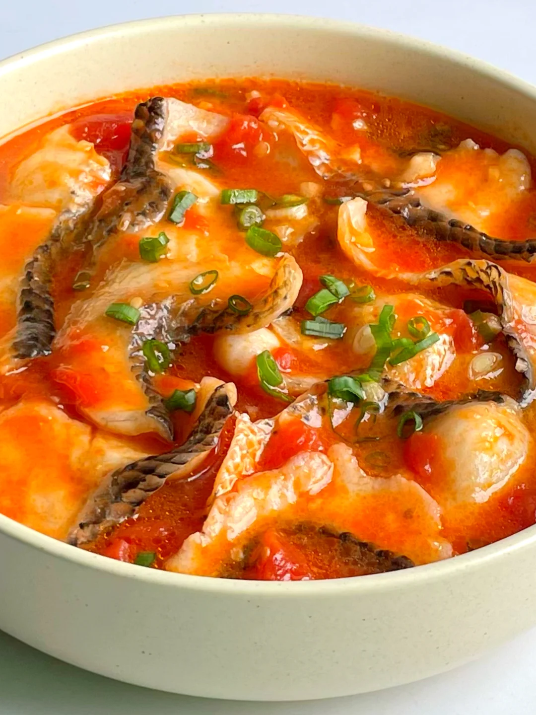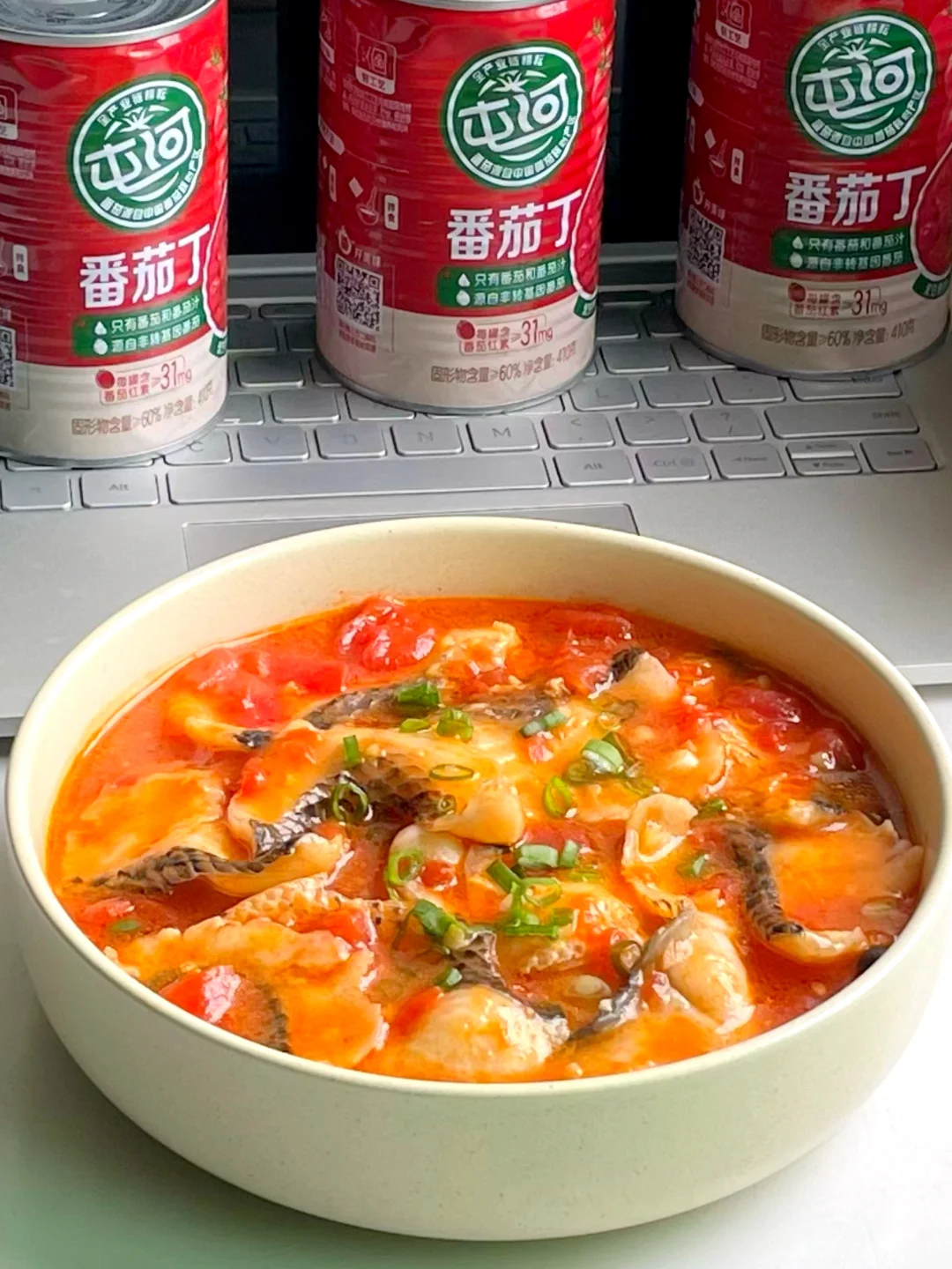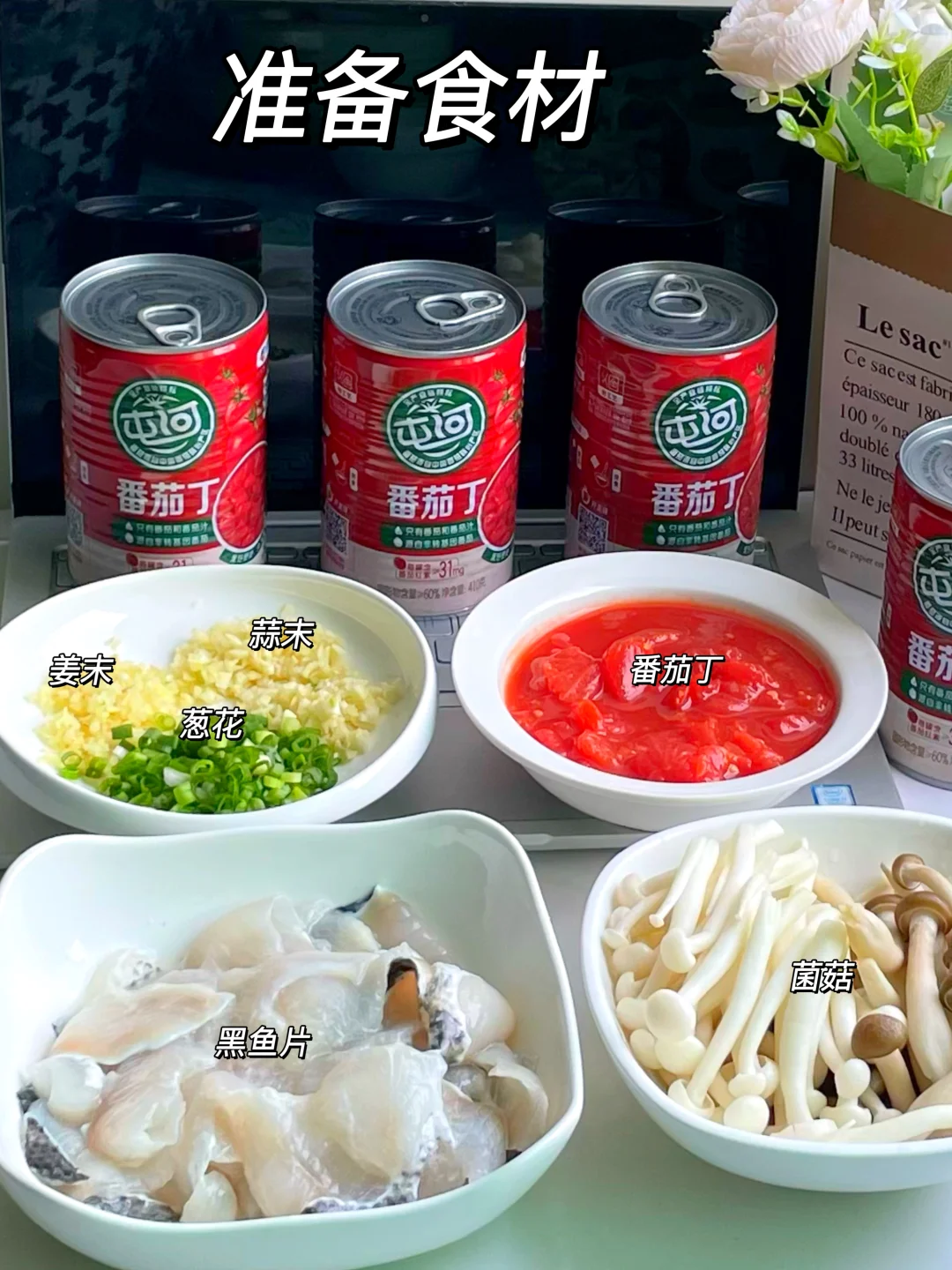 番茄罐头1罐,超市免浆黑鱼片(不用腌直接煮)