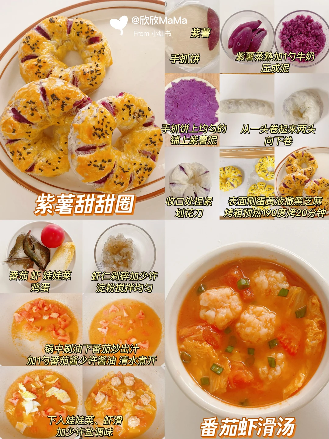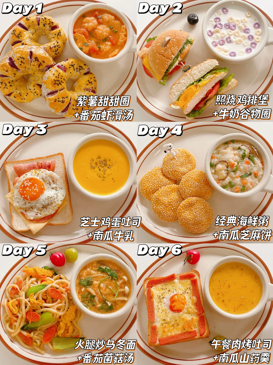 开学季来咯🔔 又到了每天发愁给小朋友做什么早餐啦! 毕竟一日三餐,早餐尤为重要!营养美味的早餐,可以让小朋友一天都元气满满🌞 今天给大家分享我家小朋友的一周早餐,营养搭配,好吃不重样👏 不知道给孩子安排什么早餐的来抄作业吧! Day1:紫薯甜甜圈+番茄虾滑汤 Day2:照烧鸡排堡+牛奶谷物圈 Day3:芝士鸡蛋吐司+南瓜牛乳 Day4:经典海鲜粥+南瓜芝麻饼 Day5:火腿乌冬面+番茄菌菇汤 Day6:午餐肉烤吐司+南瓜山药羹 🌟具体做法请看图 不重样宝宝辅食营养健康早餐宝宝辅食日记早餐吃什么