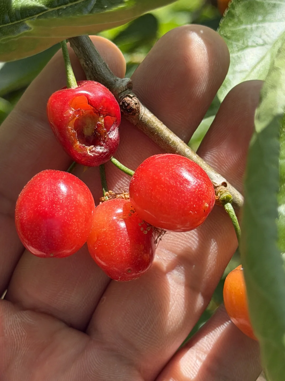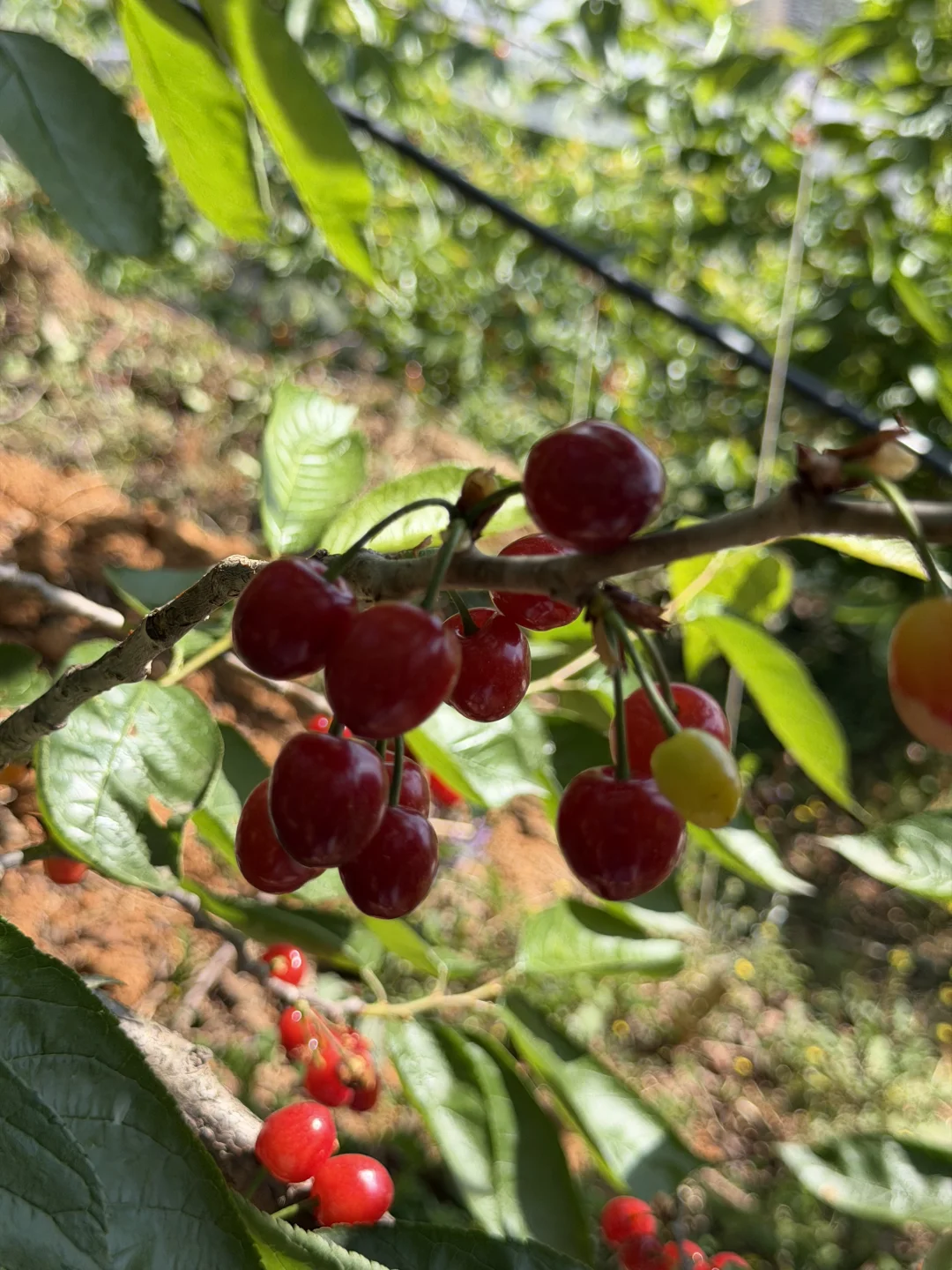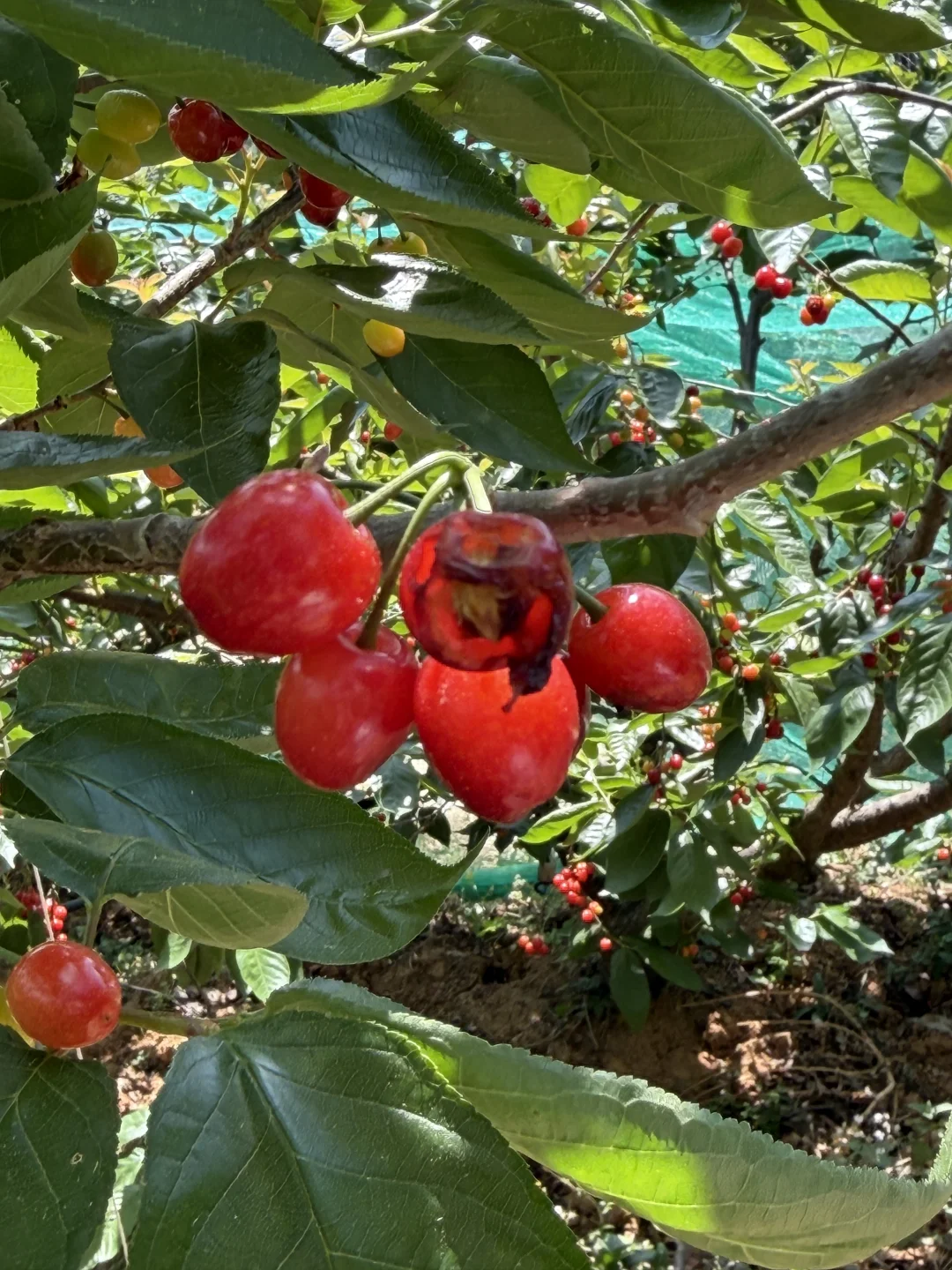 樱桃最大的天敌应该就是小鸟了 各种驱赶的音乐喇叭都用上了 还是有一半樱桃要被鸟儿吃掉 因为他真的是咪甜,而且不打💊的 如果你喜欢吃车厘子那你一定要尝一下这个小樱桃 我认为他真的比车厘子好吃,汁水更多,更甜