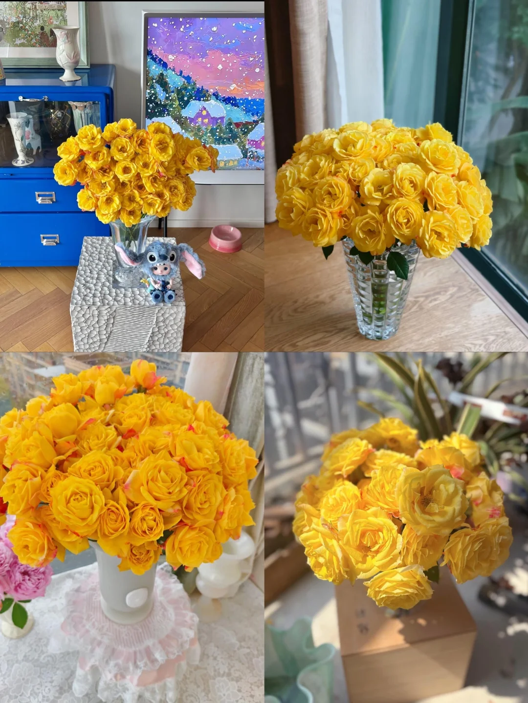 我闺蜜昨天来我家,看到花瓶里的花问我:这是啥品种啊,好好看 我说金玉仙子 她:???你逗我呢? 我:真的就叫这个!多头玫瑰的一个品种! 然后她盯着花看了半天说:确实像,金是花心,玉是花瓣,谁起的名字出来挨夸! 讲真的这个花实物比照片好看太多 奶黄奶黄的,外瓣偏白内芯暖黄 阳光下那个质感绝了,像有光透过来一样 一枝上面三四朵花,开得整整齐齐 放花瓶里单插就够好看,不用费心搭配 养护也省心 收到深水醒几个小时 平时花瓶三分之一水就行 两天换一次水剪剪根 新手也能养开,不骗你