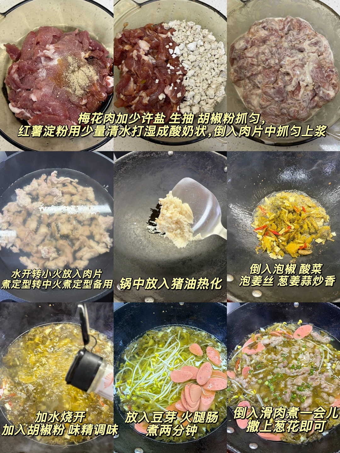 2️⃣:锅中油热(加点猪油更香)倒入泡椒 酸菜 泡姜丝 葱姜蒜炒香,加入适量清水烧开,加入少许胡椒粉 味精调味,放入豆芽和火腿肠煮熟,倒入滑肉煮一会儿,撒上葱花即可