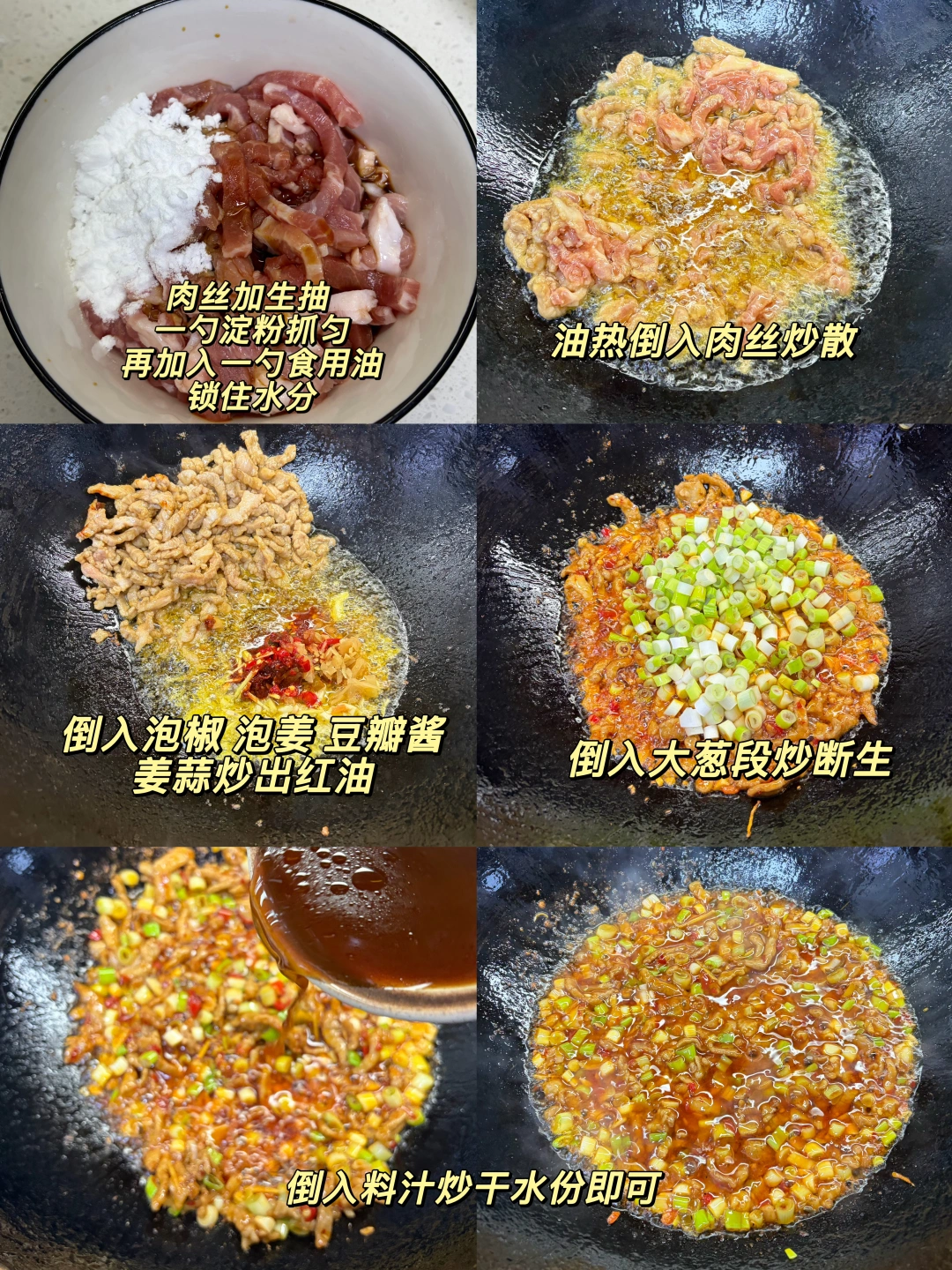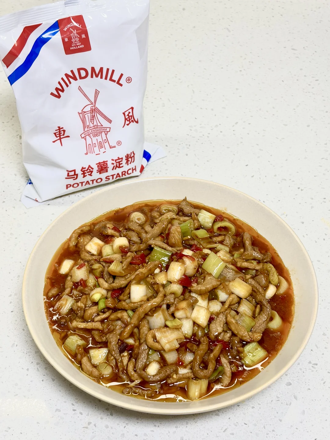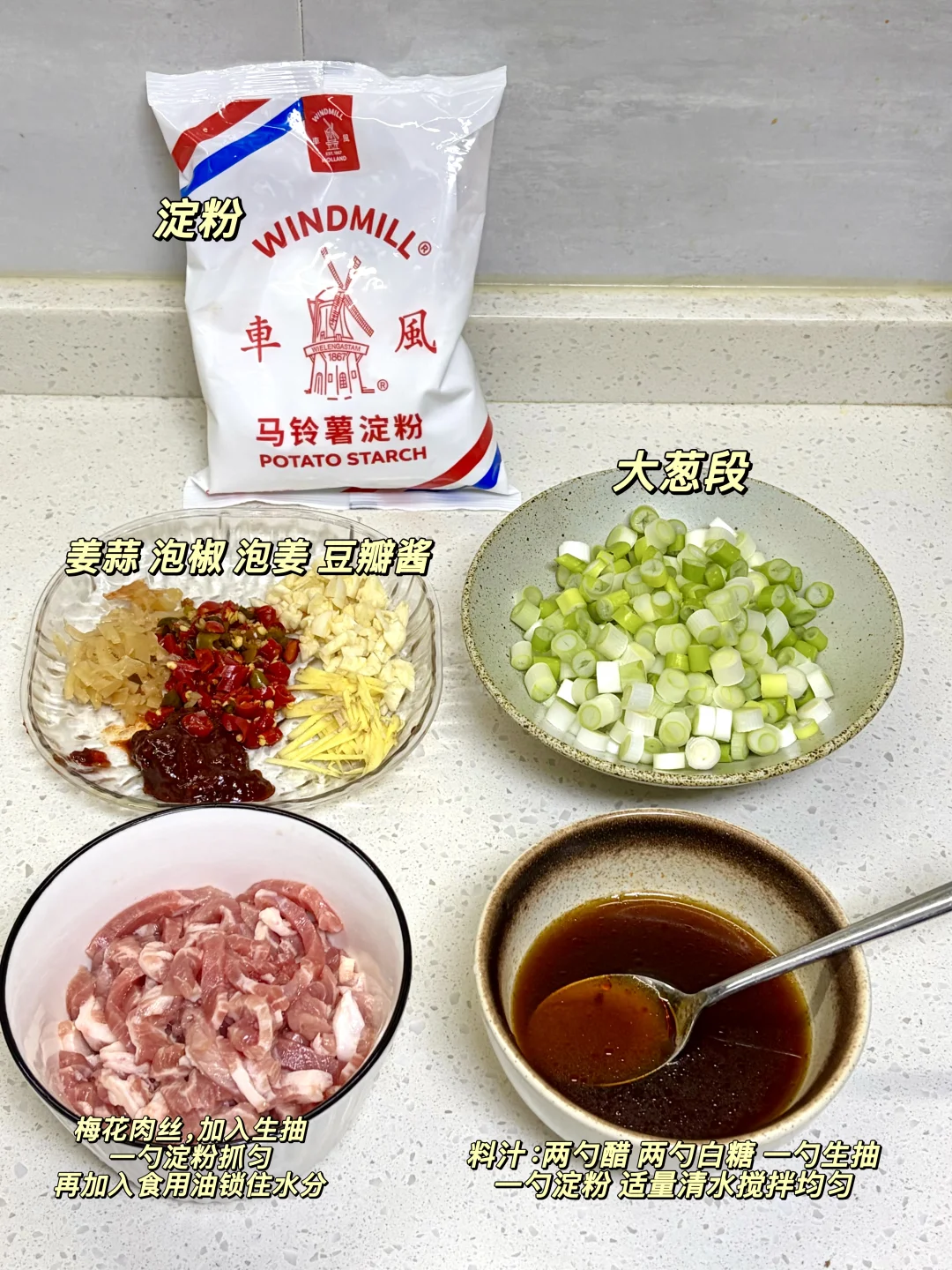 只有大葱的鱼香肉丝版本,酸辣咸香味道太丰富了,下饭一绝~ 1️⃣:肉丝加入一勺生抽 一勺淀粉抓匀,再加入一勺食用油锁住水分 2️⃣:油热(多倒点油)倒入肉丝炒散,倒入泡椒碎 泡姜 姜蒜 豆瓣酱(剁碎一点)炒出红油 3️⃣:倒入葱段翻炒断生,倒入料汁炒干水分即可 鱼香肉丝的灵魂锁汁秘诀,全靠朋友推荐的这款的风车~牌生粉,粉质细腻不结块,随便搅两下就化开,勾出的芡汁又亮又匀,酸辣咸香全被牢牢锁在肉里。炒出来的肉丝嫩嫩滑滑的,做这种菜真的少不了这款生粉~