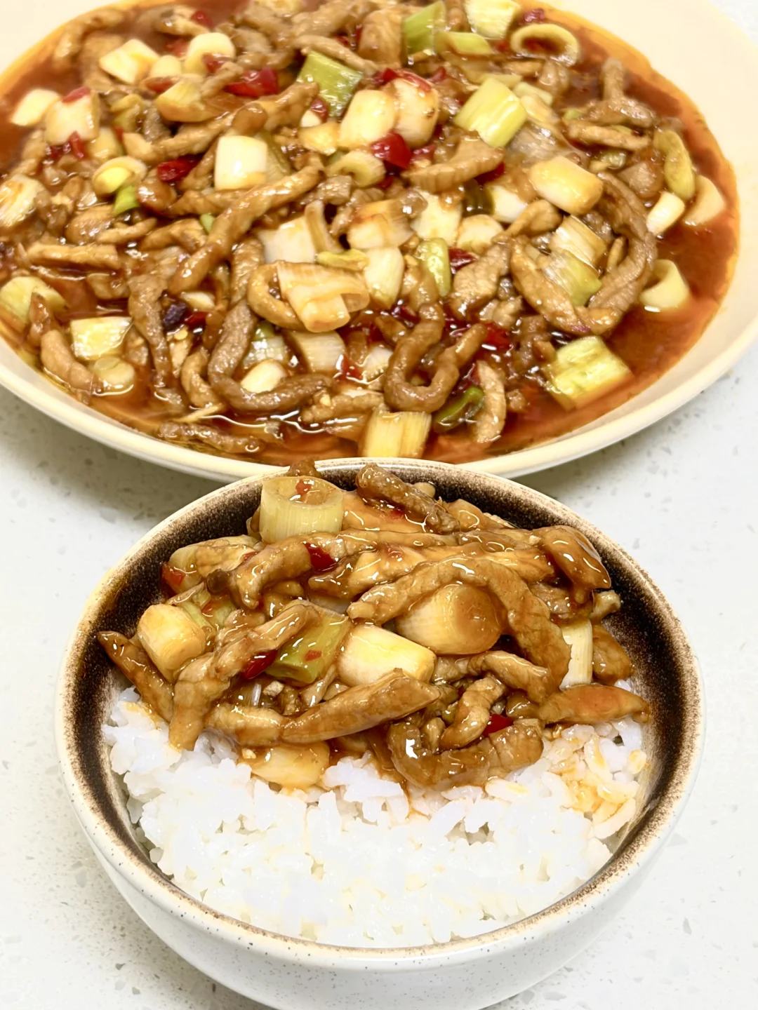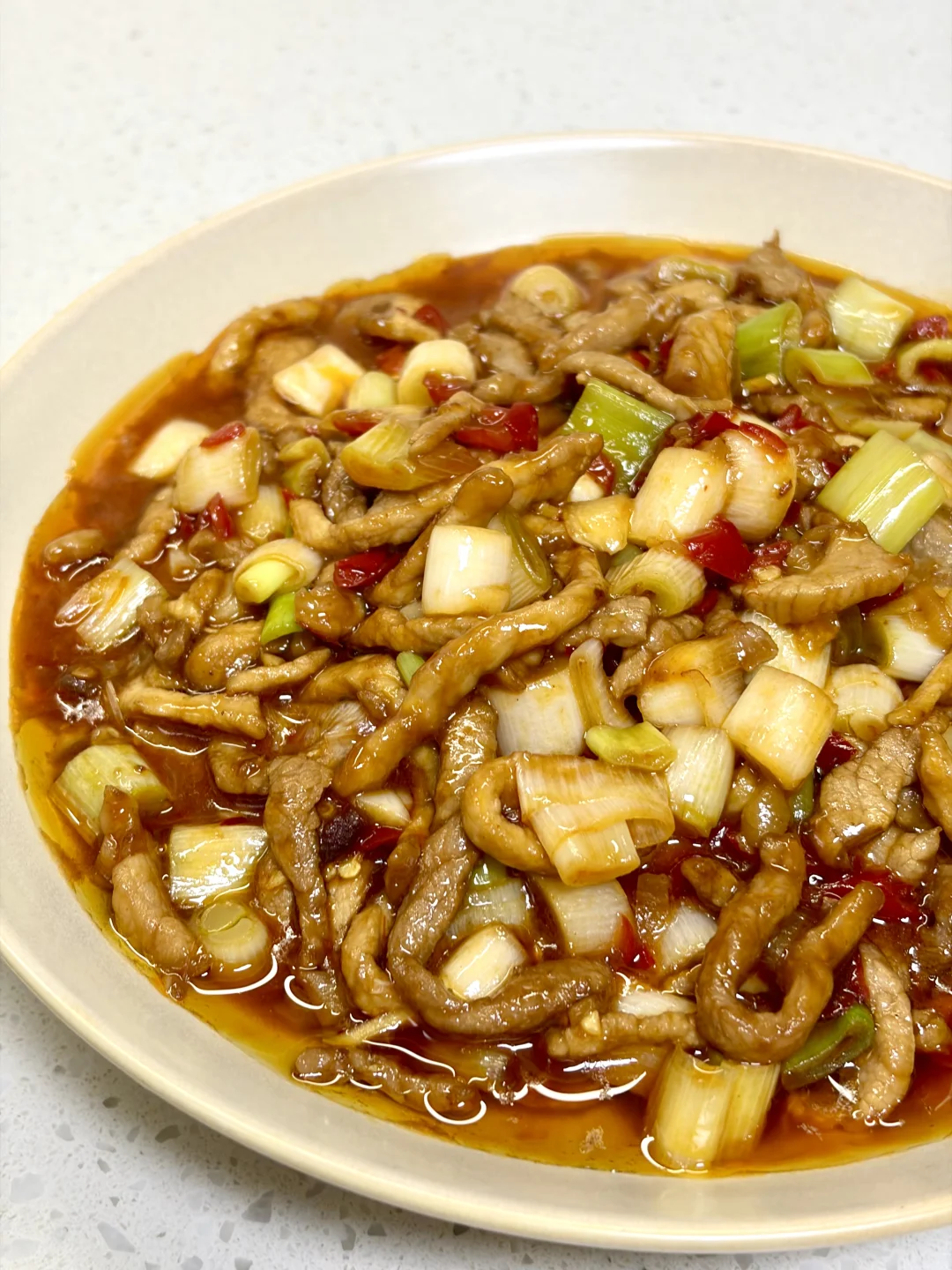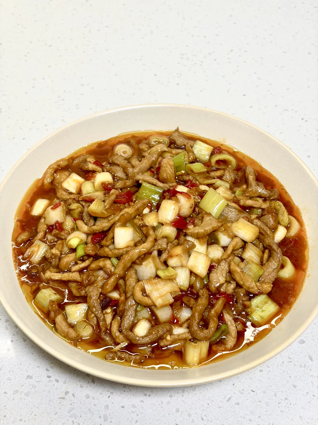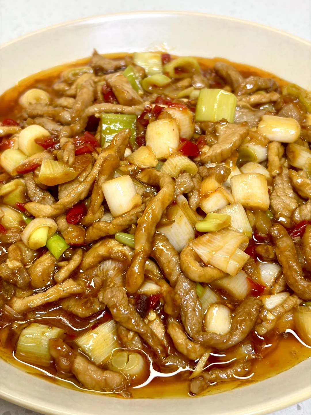 只有大葱的鱼香肉丝版本,酸辣咸香味道太丰富了,下饭一绝~ 1️⃣:肉丝加入一勺生抽 一勺淀粉抓匀,再加入一勺食用油锁住水分 2️⃣:油热(多倒点油)倒入肉丝炒散,倒入泡椒碎 泡姜 姜蒜 豆瓣酱(剁碎一点)炒出红油 3️⃣:倒入葱段翻炒断生,倒入料汁炒干水分即可 鱼香肉丝的灵魂锁汁秘诀,全靠朋友推荐的这款的风车~牌生粉,粉质细腻不结块,随便搅两下就化开,勾出的芡汁又亮又匀,酸辣咸香全被牢牢锁在肉里。炒出来的肉丝嫩嫩滑滑的,做这种菜真的少不了这款生粉~