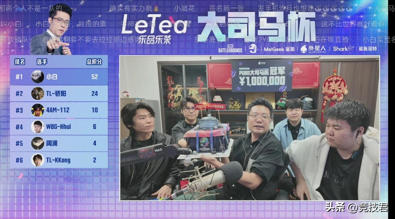大司马吃鸡杯,路人小白夺冠斩获一百万奖金,缔造五个不可能的神话! 1.小组赛时小白本已被淘汰,因同组选手2yo出事退赛,他才获得替补进入半决赛的机会。 2.决赛里,小白首个登场,豪取7杀14分,此成绩一直保持到最后一位选手骄阳登场。原本小白基本锁定冠军,却被骄阳24分反超。 3.小白在决赛第二轮最后一个出场,若想夺冠,必须达成13杀或者6杀吃鸡,这对一贯采用roll点打法的他而言,挑战极大。 4.小白最终13杀成功吃鸡,在决赛最后一把、最后一局实现反超,以52分夺冠,可谓运气与操作齐飞。 5.小白吃鸡后开启直播,十分钟涨粉二十万,直播间人气超10w+,这波流量之大,令人难以置信! 实话实说,这是我近几年看过最精彩的比赛,全程高潮迭起,毫无冷场。