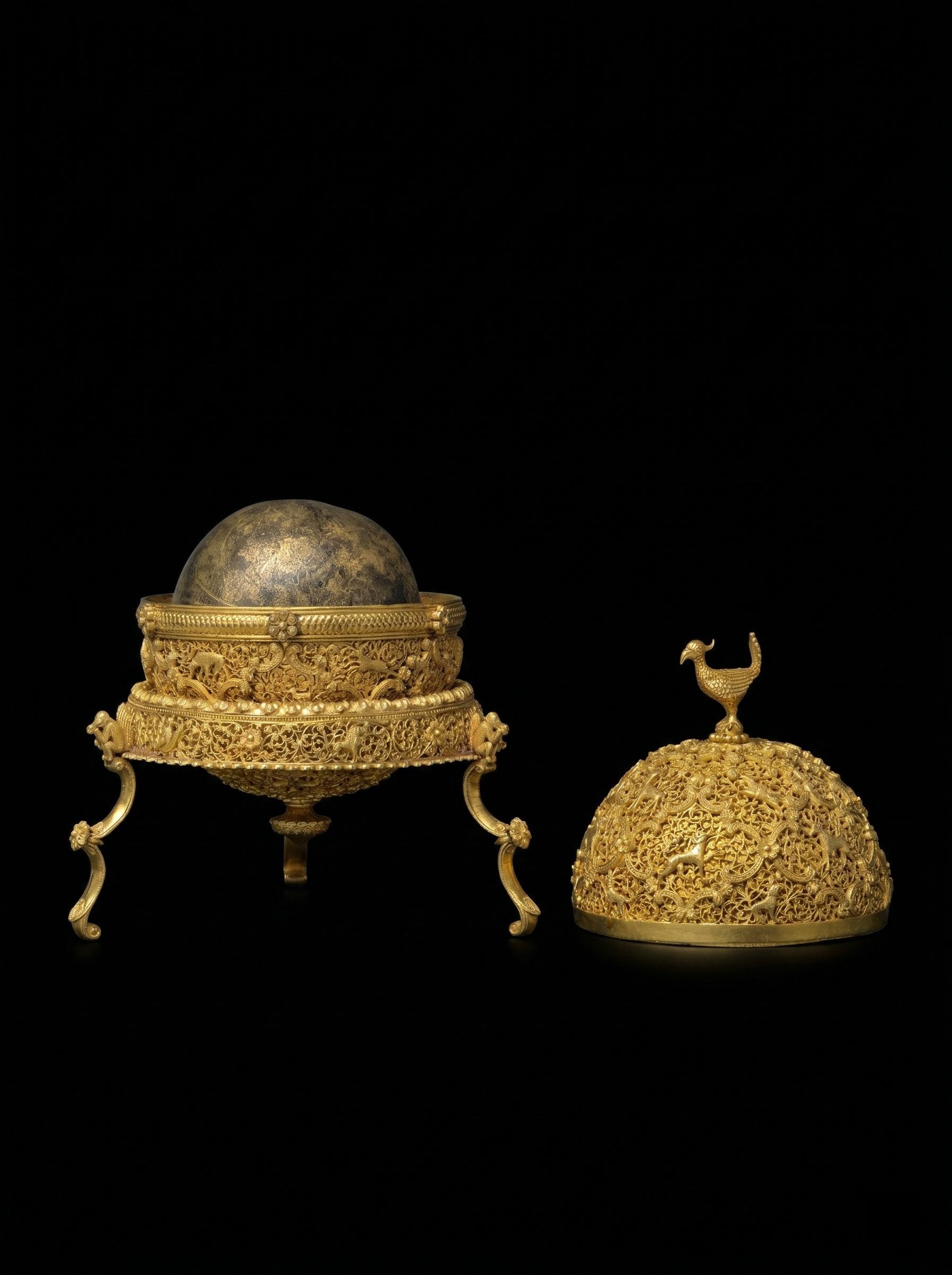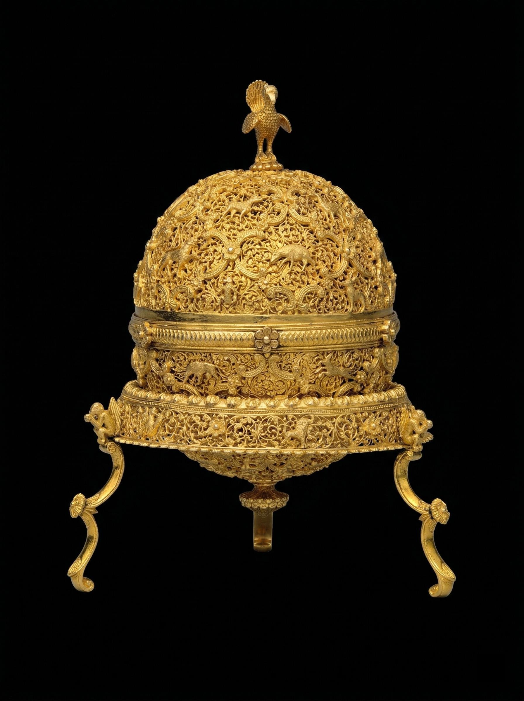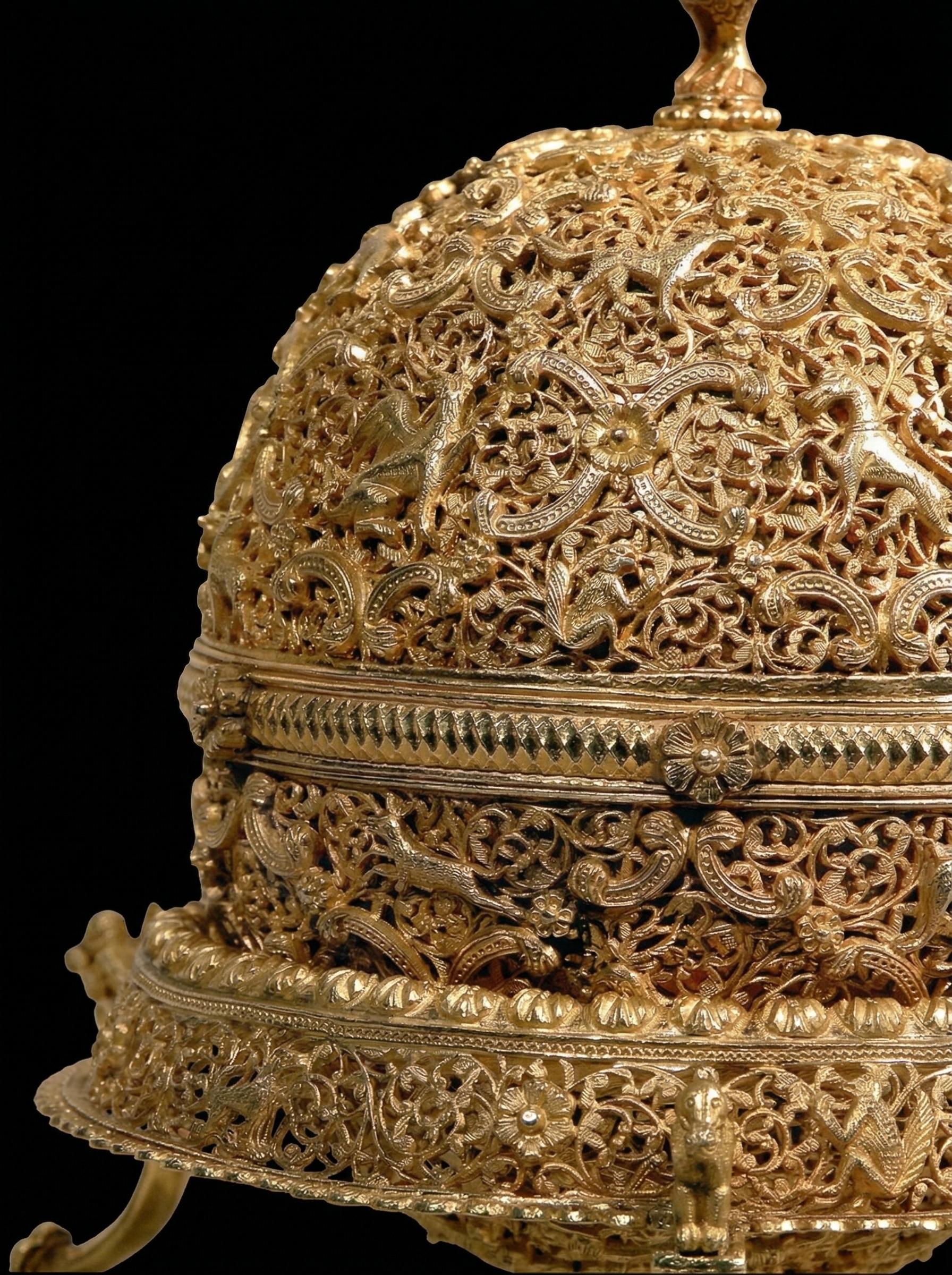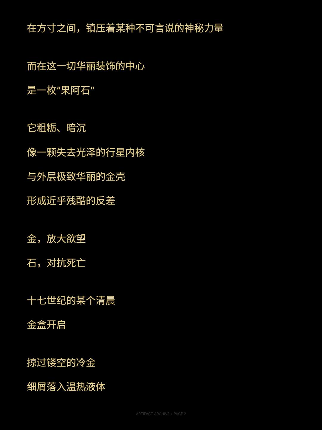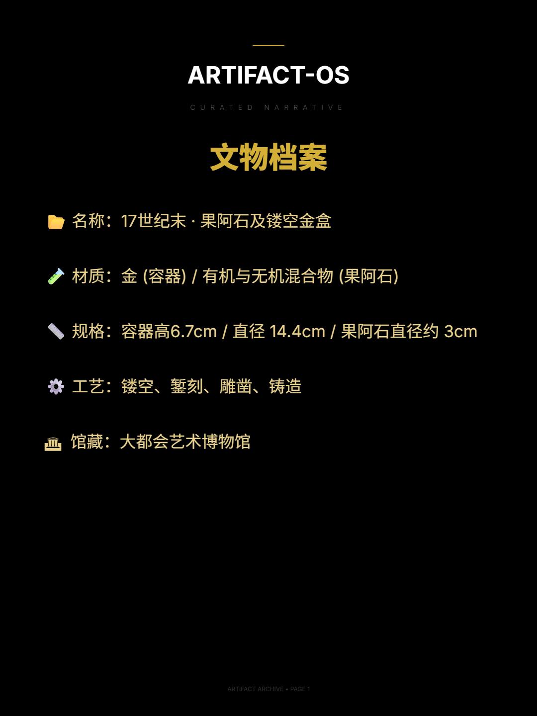 黄金囚徒 | 欲望与神性的标本。🌊人不能占有永恒,但可以渴望它 —— 【印度】拉宾德拉纳特 · 泰戈尔 这是一段关于“治愈”的结构化幻觉 光线在此不再连续 镂空金箔将其切割、离散 形成一种近乎呼吸感的高频闪烁 外层,被无限增殖的金色藤蔓中 隐藏着独角兽与狮鹫的呼吸 它们是跨越欧亚大陆的守护者 在方寸之间,镇压着某种不可言说的神秘力量 而在这一切华丽装饰的中心 是一枚“果阿石” 它粗粝、暗沉 像一颗失去光泽的行星内核 与外层极致华丽的金壳 形成近乎残酷的反差 金,放大欲望 石,对抗死亡 十七世