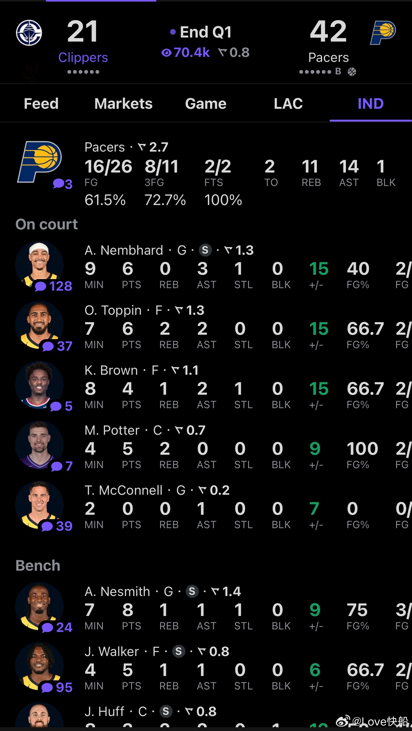 第一节🔚,快船落后21分,对面也太准了吧!