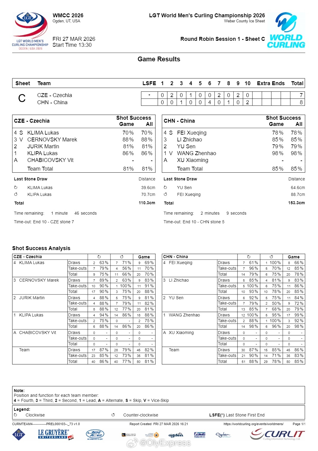 【男子冰壶世锦赛中国队开门红】2026年男子冰壶世锦赛 3月27日美国奥格登,2026年男子冰壶世锦赛揭幕,中国队在循环赛首场比赛中,凭借最后一局拿下的两分,8-7险胜捷克,取得开门红。本场比赛徐晓明替补,王振豪、于森、李智超和费学清出任一到四垒。北京时间29日4时,中国队将对阵瑞典。