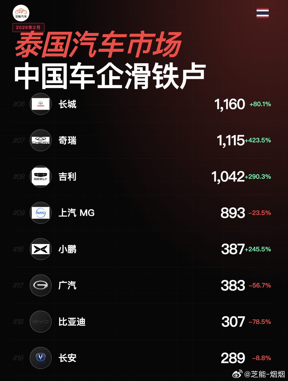 亚洲车市|泰国2026年2月:补贴退坡中国品牌下滑泰国车市2月数据出来,对电动