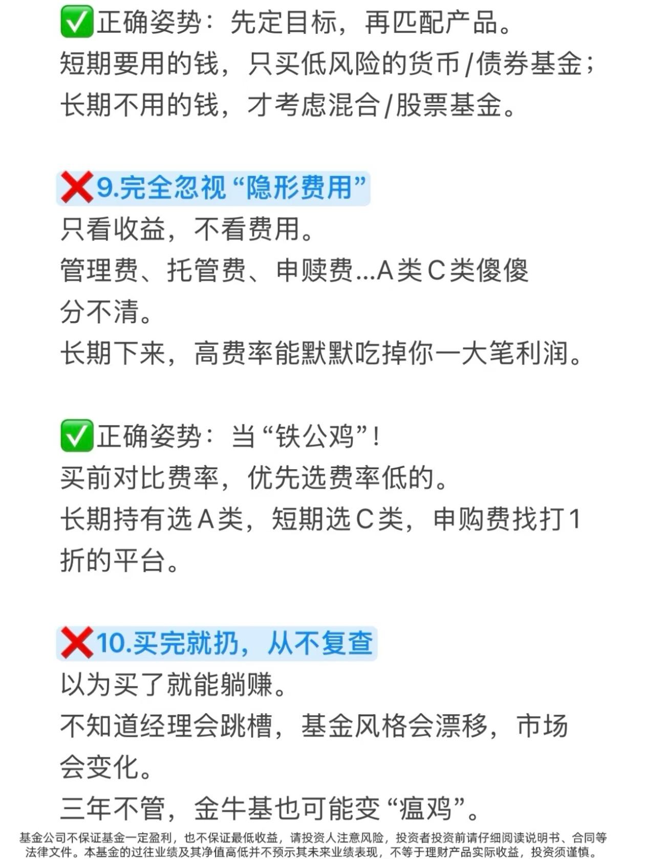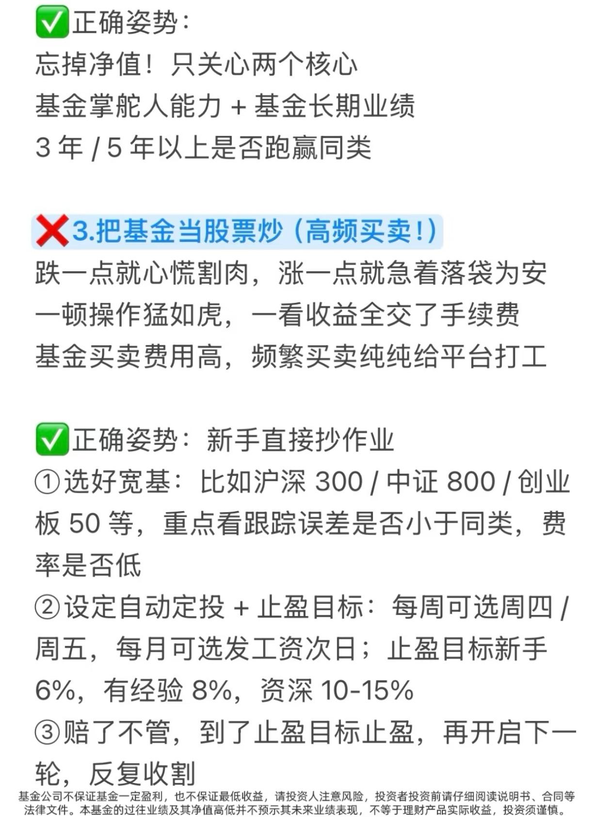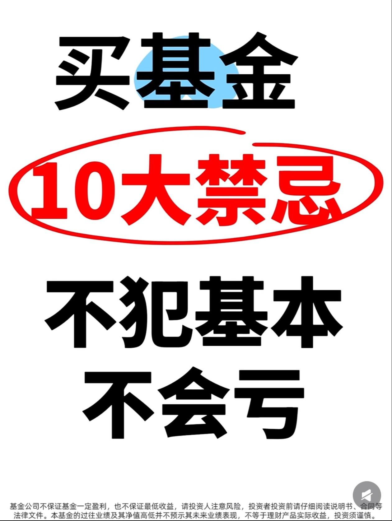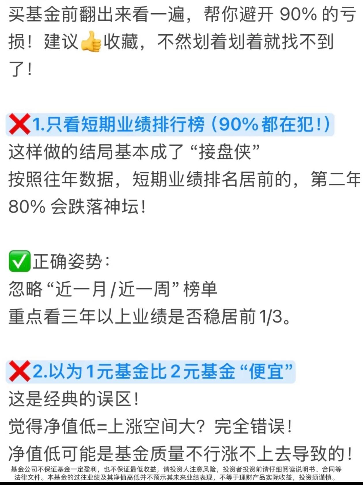 买基金亏麻了?90%的人都踩了这10个大坑! 有没有发现一个扎心真相? 你买基金,追着短期排行榜冲,听大V朋友瞎买,把1元基金当便宜货抄底,把基金当股票天天高频买卖… 结果一年下来,钱没赚到,手续费交了一大堆,账户绿得发慌,还不知道自己亏在哪! 今天这10大禁忌,把散户买基金最容易踩的坑扒得明明白白,看完直接帮你避开90%的亏损,建议收藏,买基金前翻出来看一遍! ❌坑1:只看短期业绩排行榜 短期涨得猛的基金,第二年80%都会跌落神坛,追高买入=妥妥接盘侠 ✅正确做法:忽略近一周/近一月榜单,重点看3年以上业绩是否稳居同类前1/3 ❌坑2:以为1元基金比2元基金“便宜” 净值低≠上涨空间大,大概率是基金质量差涨不上去,和便宜半毛钱关系没有 ✅正确做法:忘掉净值!只看基金经理能力+长期业绩,3/5年以上是否跑赢同类 ❌坑3:把基金当股票炒,高频买卖 跌了割肉涨了卖,一顿操作猛如虎,收益全交手续费,纯给平台打工 ✅正确做法:新手直接抄作业:选宽基+自动定投+止盈目标,跌了不管,到点就卖,反复收割 ❌坑4:无脑跟风大V/朋友 大V可能接广告,朋友可能只是运气好,不懂底层逻辑就买入,亏了只能自己扛 ✅正确做法:别人推荐只是观察清单,用四维选基法自己研究,对本金负责 ❌坑5:All In单押一个赛道 听说新能源/芯片火就全仓砸进去,行业波动极大,一回调账户直接绿到发慌 ✅正确做法:用核心-卫星策略,大部分钱买宽基打底,小部分钱尝试行业,分散风险 ❌坑6:期望暴富,心态崩塌 用炒股预期玩基金,嫌赚得慢天天盯盘,心态随时爆炸,永远拿不住优质基金 ✅正确做法:降低预期!基金年化8-15%就是顶级水平,把它当慢慢变富的工具,不是暴富器 ❌坑7:对自己买的基金一无所知 重仓什么行业、经理是谁、风格是什么,一问三不知,纯靠运气,最终靠实力亏光 ✅正确做法:买入前必做功课,花20分钟看详情页、经理介绍和定期报告 ❌坑8:没有目标,闲钱就随便投 没明确目标,就不知道选什么基金、持有多久,很容易追涨杀跌 ✅正确做法:先定目标再选品,短期用钱买货币/债券基金,长期闲钱才考虑股票/混合基金 ❌坑9:完全忽视“隐形费用” 只看收益不看费率,管理费、托管费、申赎费傻傻分不清,高费率长期吃掉大半利润 ✅正确做法:当铁公鸡!买前对比费率,长期持有选A类,短期选C类,申购费找打1折平台 ❌坑10:买完就扔,从不复查 以为买了就能躺赚,三年不管,金牛基也能变瘟鸡 ✅正确做法:每季度检查一次,看业绩、经理、持仓有无变化,及时调整 💥新手避坑速记清单,一秒记住: 1. 不看短期业绩,只看3年以上长期收益 2. 不看净值高低,只看基金经理能力 3. 不频繁买卖,定投+止盈才是王道 4. 不跟风买入,自己做功课再下手 5. 不单押赛道,核心-卫星策略稳得住 6. 不期待暴富,降低预期慢慢变富 7. 不盲目买入,买前必做功课 8. 不随便乱投,先定目标再选品 9. 不忽视费率,选低费率的基金 10. 不买完躺平,每季度定期复查 这10个坑,你踩中了几个? 评论区聊聊你买基金踩过的最惨的坑,帮更多人避避雷! ⚠️ 免责声明:本文仅为投资知识科普,不构成任何投资建议。市场有风险,投资需谨慎,投资者应根据自身情况独立决策。 基金理财 买基金避坑 基金入门 投资理财