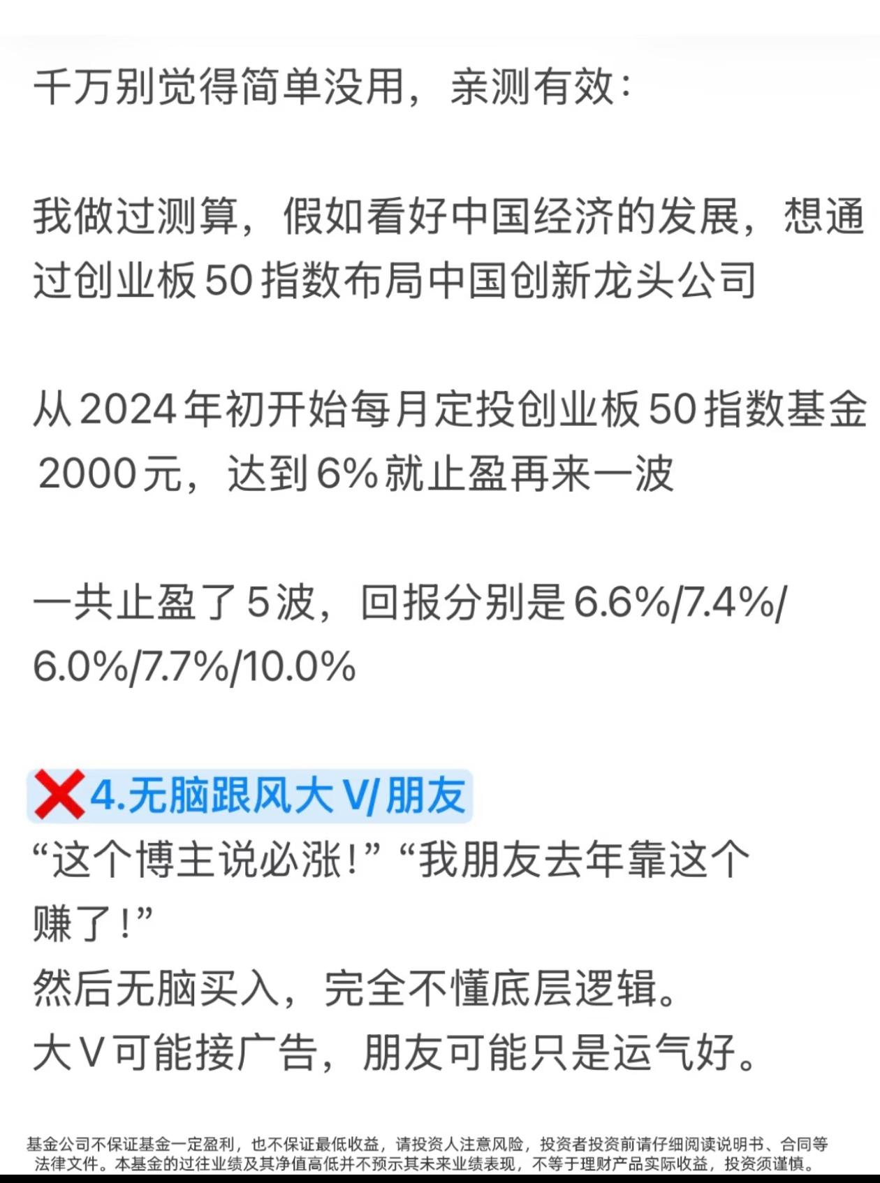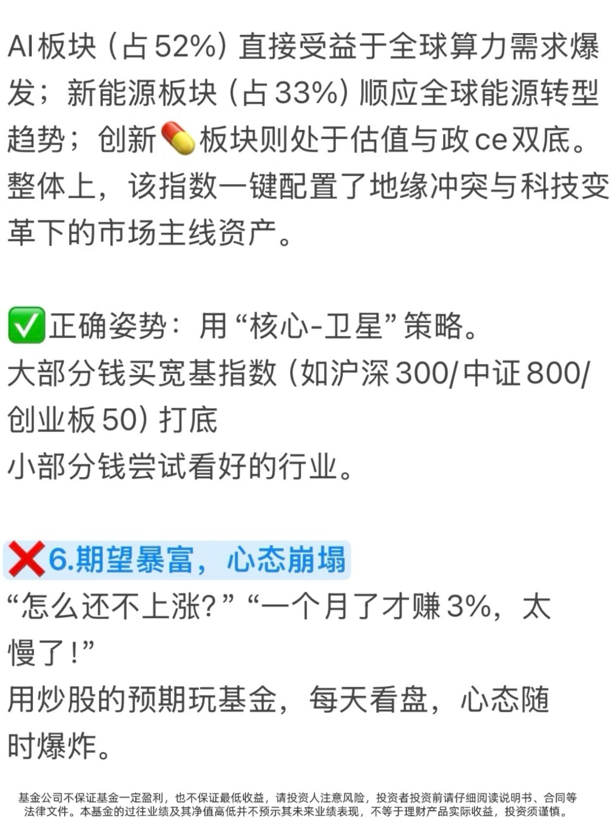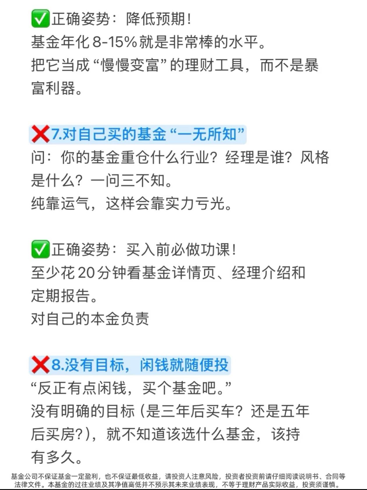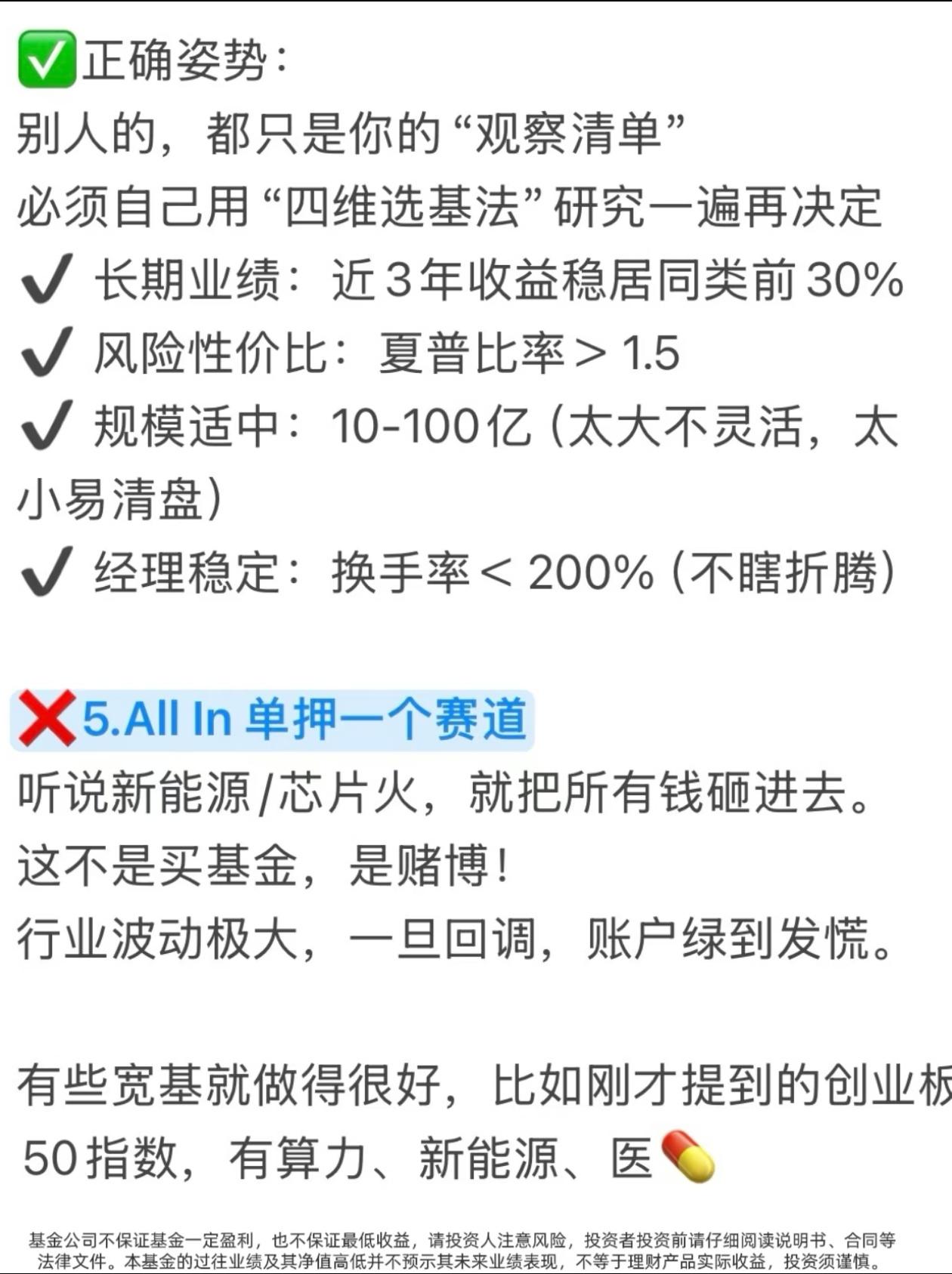 买基金亏麻了?90%的人都踩了这10个大坑! 有没有发现一个扎心真相? 你买基金,追着短期排行榜冲,听大V朋友瞎买,把1元基金当便宜货抄底,把基金当股票天天高频买卖… 结果一年下来,钱没赚到,手续费交了一大堆,账户绿得发慌,还不知道自己亏在哪! 今天这10大禁忌,把散户买基金最容易踩的坑扒得明明白白,看完直接帮你避开90%的亏损,建议收藏,买基金前翻出来看一遍! ❌坑1:只看短期业绩排行榜 短期涨得猛的基金,第二年80%都会跌落神坛,追高买入=妥妥接盘侠 ✅正确做法:忽略近一周/近一月榜单,重点看3年以上业绩是否稳居同类前1/3 ❌坑2:以为1元基金比2元基金“便宜” 净值低≠上涨空间大,大概率是基金质量差涨不上去,和便宜半毛钱关系没有 ✅正确做法:忘掉净值!只看基金经理能力+长期业绩,3/5年以上是否跑赢同类 ❌坑3:把基金当股票炒,高频买卖 跌了割肉涨了卖,一顿操作猛如虎,收益全交手续费,纯给平台打工 ✅正确做法:新手直接抄作业:选宽基+自动定投+止盈目标,跌了不管,到点就卖,反复收割 ❌坑4:无脑跟风大V/朋友 大V可能接广告,朋友可能只是运气好,不懂底层逻辑就买入,亏了只能自己扛 ✅正确做法:别人推荐只是观察清单,用四维选基法自己研究,对本金负责 ❌坑5:All In单押一个赛道 听说新能源/芯片火就全仓砸进去,行业波动极大,一回调账户直接绿到发慌 ✅正确做法:用核心-卫星策略,大部分钱买宽基打底,小部分钱尝试行业,分散风险 ❌坑6:期望暴富,心态崩塌 用炒股预期玩基金,嫌赚得慢天天盯盘,心态随时爆炸,永远拿不住优质基金 ✅正确做法:降低预期!基金年化8-15%就是顶级水平,把它当慢慢变富的工具,不是暴富器 ❌坑7:对自己买的基金一无所知 重仓什么行业、经理是谁、风格是什么,一问三不知,纯靠运气,最终靠实力亏光 ✅正确做法:买入前必做功课,花20分钟看详情页、经理介绍和定期报告 ❌坑8:没有目标,闲钱就随便投 没明确目标,就不知道选什么基金、持有多久,很容易追涨杀跌 ✅正确做法:先定目标再选品,短期用钱买货币/债券基金,长期闲钱才考虑股票/混合基金 ❌坑9:完全忽视“隐形费用” 只看收益不看费率,管理费、托管费、申赎费傻傻分不清,高费率长期吃掉大半利润 ✅正确做法:当铁公鸡!买前对比费率,长期持有选A类,短期选C类,申购费找打1折平台 ❌坑10:买完就扔,从不复查 以为买了就能躺赚,三年不管,金牛基也能变瘟鸡 ✅正确做法:每季度检查一次,看业绩、经理、持仓有无变化,及时调整 💥新手避坑速记清单,一秒记住: 1. 不看短期业绩,只看3年以上长期收益 2. 不看净值高低,只看基金经理能力 3. 不频繁买卖,定投+止盈才是王道 4. 不跟风买入,自己做功课再下手 5. 不单押赛道,核心-卫星策略稳得住 6. 不期待暴富,降低预期慢慢变富 7. 不盲目买入,买前必做功课 8. 不随便乱投,先定目标再选品 9. 不忽视费率,选低费率的基金 10. 不买完躺平,每季度定期复查 这10个坑,你踩中了几个? 评论区聊聊你买基金踩过的最惨的坑,帮更多人避避雷! ⚠️ 免责声明:本文仅为投资知识科普,不构成任何投资建议。市场有风险,投资需谨慎,投资者应根据自身情况独立决策。 基金理财 买基金避坑 基金入门 投资理财