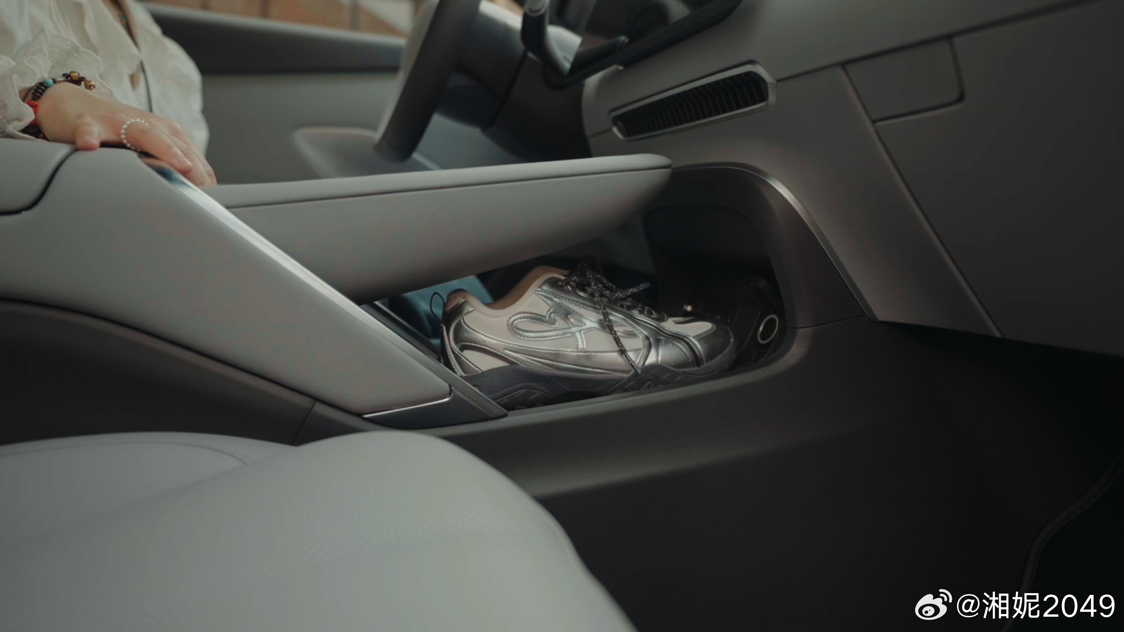 然后就是中央扶手箱那块的设计,可以放下一双替换的鞋,如果工作有需要穿高跟鞋上班的姐妹就可以把鞋放在这,非常趁手,不用再跑到后备箱去换。