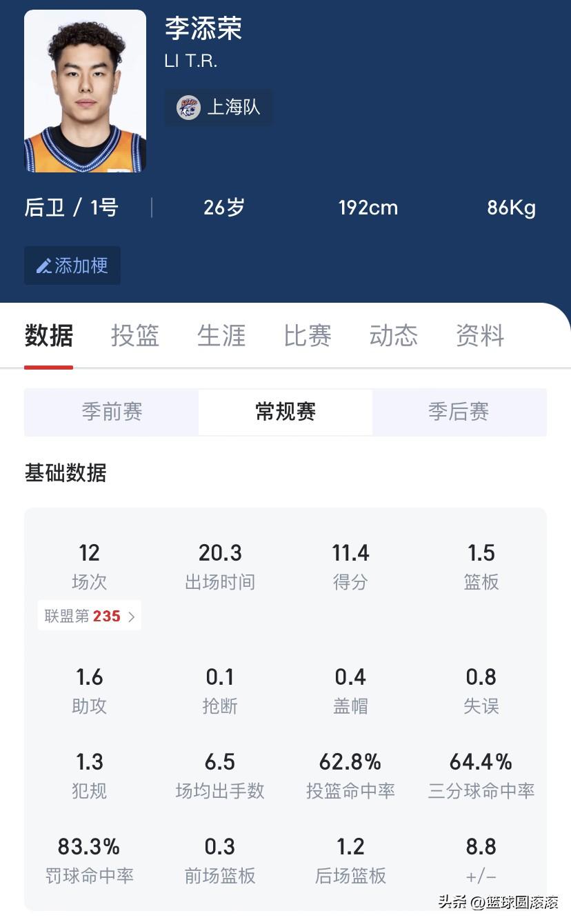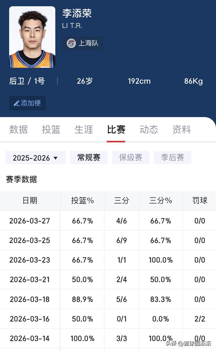[震惊][震惊][震惊]上海队李添荣这准度,简直是开了挂! 看了李添荣最近的比赛,我真的要喊一句:这哥们的投篮是装了导航吗? 最近7场常规赛,他三分球26投21中,命中率高达80.8%!单场最高6记三分,最低也有1记,甚至有两场100%命中!场均11.4分,投篮命中率62.8%,三分命中率64.4%,这数据放在整个CBA都是炸裂级别的! 以前只知道他身体素质劲爆,能飞能扣,现在三分线外直接化身“冷血杀手”,不管是接球跳投还是追身三分,抬手就有,连防守球员都懵了:这还是我认识的那个李添荣吗? 从之前的起伏不定到现在的稳定输出,李添荣的进步肉眼可见。上海队有这样的神射手,季后赛真的可以期待一下了! 谁能想到,曾经靠身体吃饭的小将,现在靠投篮统治了外线?这就是努力的力量啊! 李添荣 上海久事 CBA 三分神射手 篮球