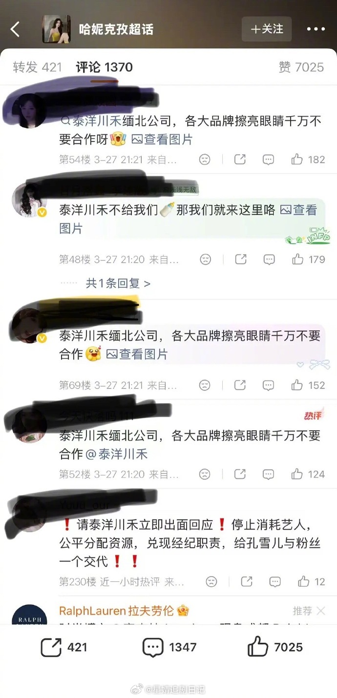 孔雪儿粉丝因为不满公司资源分配,在哈妮克孜的商务微博评论区维权。两人都是泰洋川禾的艺人…感觉有点离谱,孔雪儿刚有效播剧,粉丝就把哈妮克孜的商务博给冲了,刚有点好感又被粉丝浇灭了