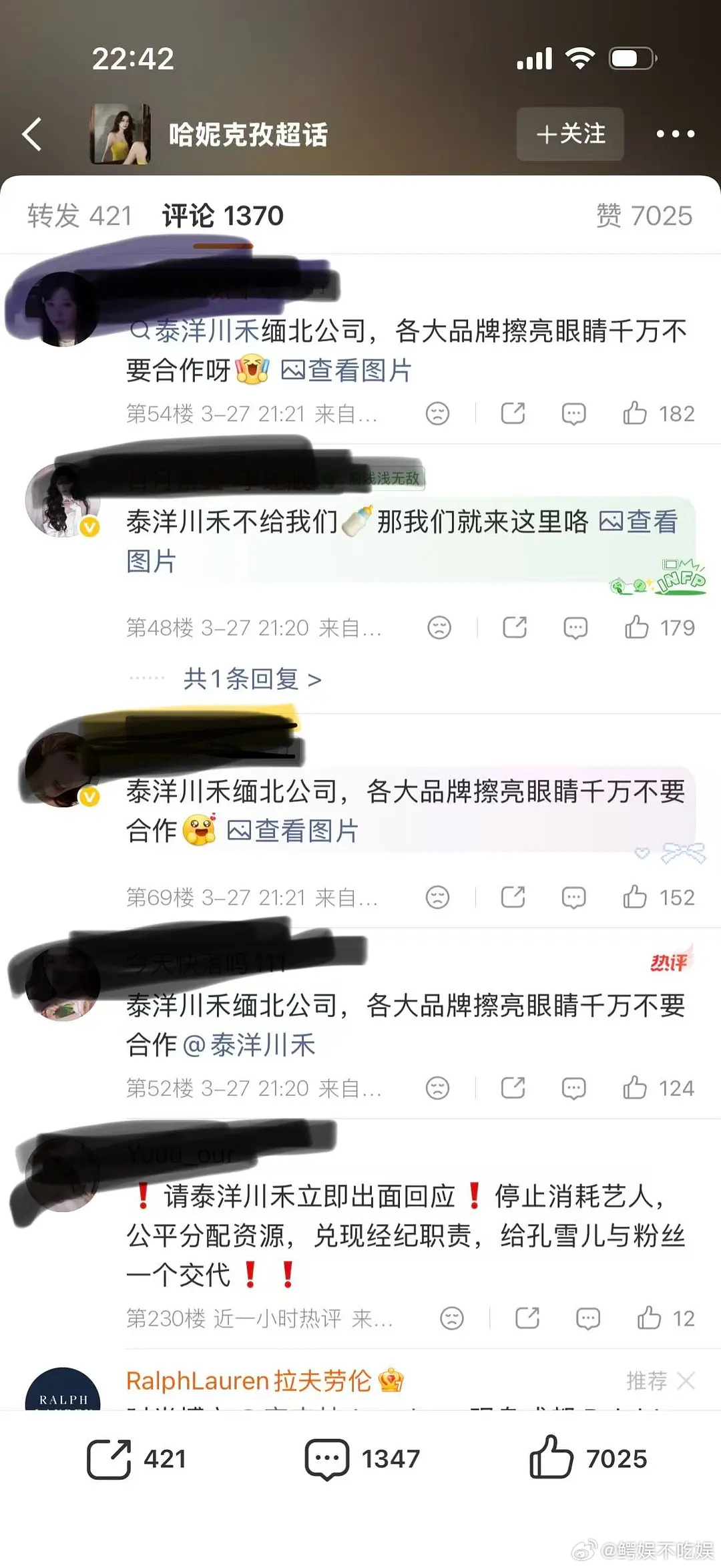 孔雪儿粉丝不满意自家的商务,就在拉夫劳伦官博下把同公司女艺人哈尼克孜的商务给屠了