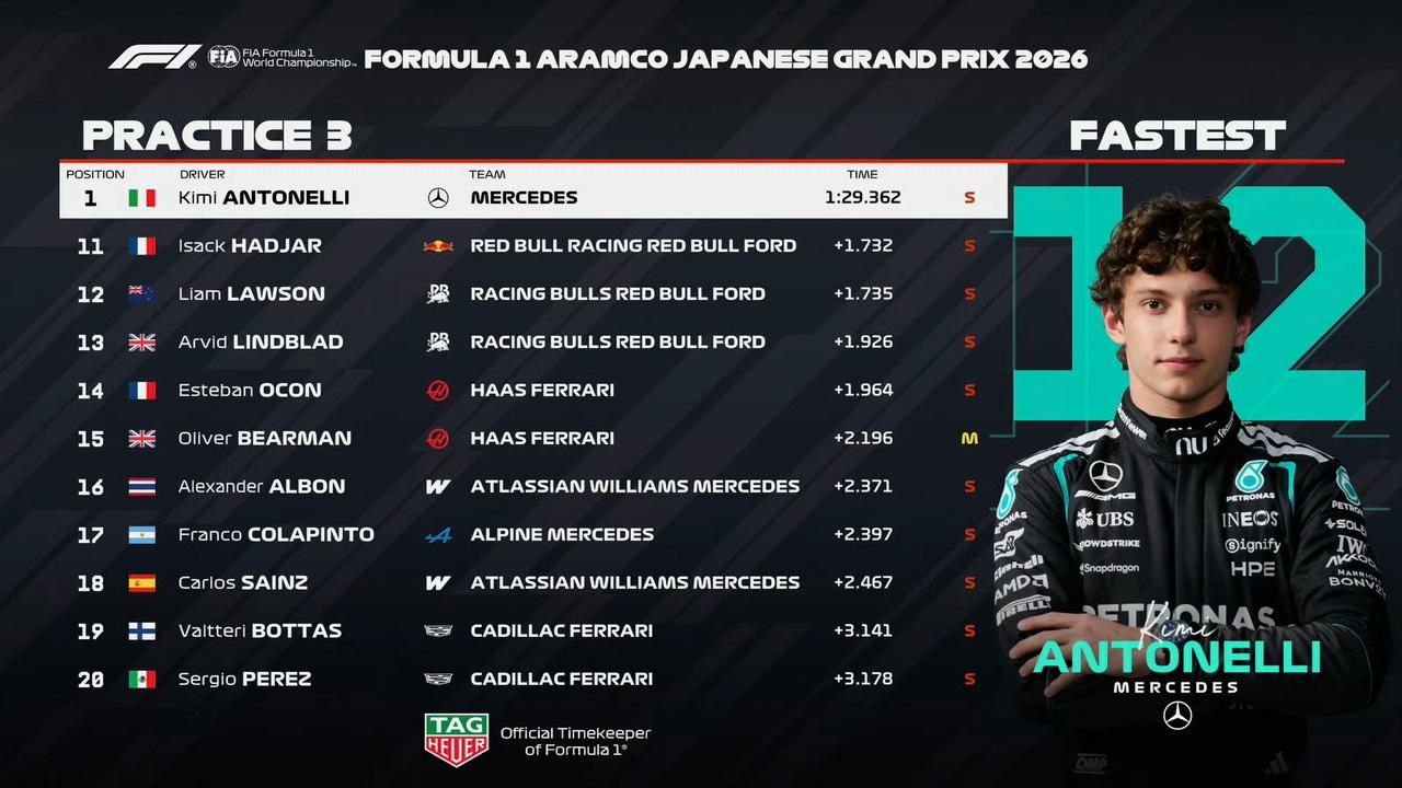 原来一练二练只是意外,三练才是真实实力!排位赛看来很有看点…… 2026F1日本大奖赛三练结束,梅奔依然稳居第一第二,而且比第三的乐扣快了0.8秒多,比第四的皮亚快了1秒。