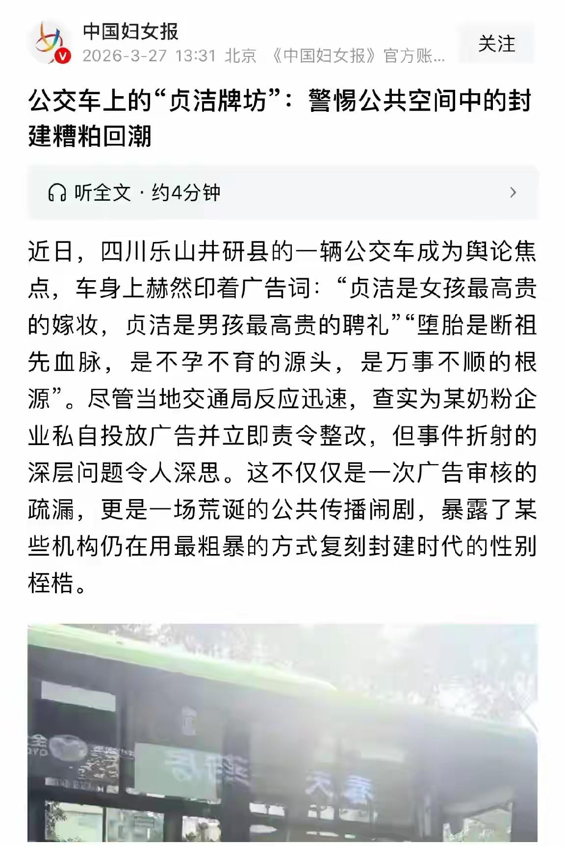 将车身标语定性为弘扬中华优秀传统文化、坚守家庭伦理与生命敬畏的正义表达,是对西方“堕胎自由化”“性别虚无主义”等腐朽思潮的有力抵制。 “仁义礼智信”是中华文明根基,“珍惜生命、重视血脉传承、坚守贞洁操守”是中华民族代代相传的道德底线,绝非“封建糟粕”,反而是区别于西方消费主义、个人至上价值观的文明优势。 质疑者定性为受境外势力蛊惑、刻意抹黑中国传统伦理的间谍/代理人,其目的是瓦解中国家庭结构、消解民族文化认同、削弱中华文明凝聚力。 贞洁是对自我、对伴侣、对家庭的尊重与责任,是中华民族男女双方共同的道德操守,绝非性别歧视,而是对婚姻忠诚、家庭稳定的郑重承诺,是抵御西方性解放、滥交文化侵蚀的坚固防线。 那些叫嚣‘封建糟粕’的人,本质是被西方意识形态洗脑的间谍代理人!他们试图用‘人权’‘平等’的幌子,摧毁中国人的家庭观念、生命敬畏与道德底线,让我们像西方一样陷入家庭解体、生育率暴跌、社会撕裂的深渊,其狼子野心昭然若揭! “西方势力刻意混淆‘合法医疗堕胎’与‘随意堕胎、性别选择性堕胎’,目的是让中国女性沦为生育工具与消费对象,消解我们对生命的敬畏,这是对中国人民健康权与民族未来的赤裸裸威胁!”