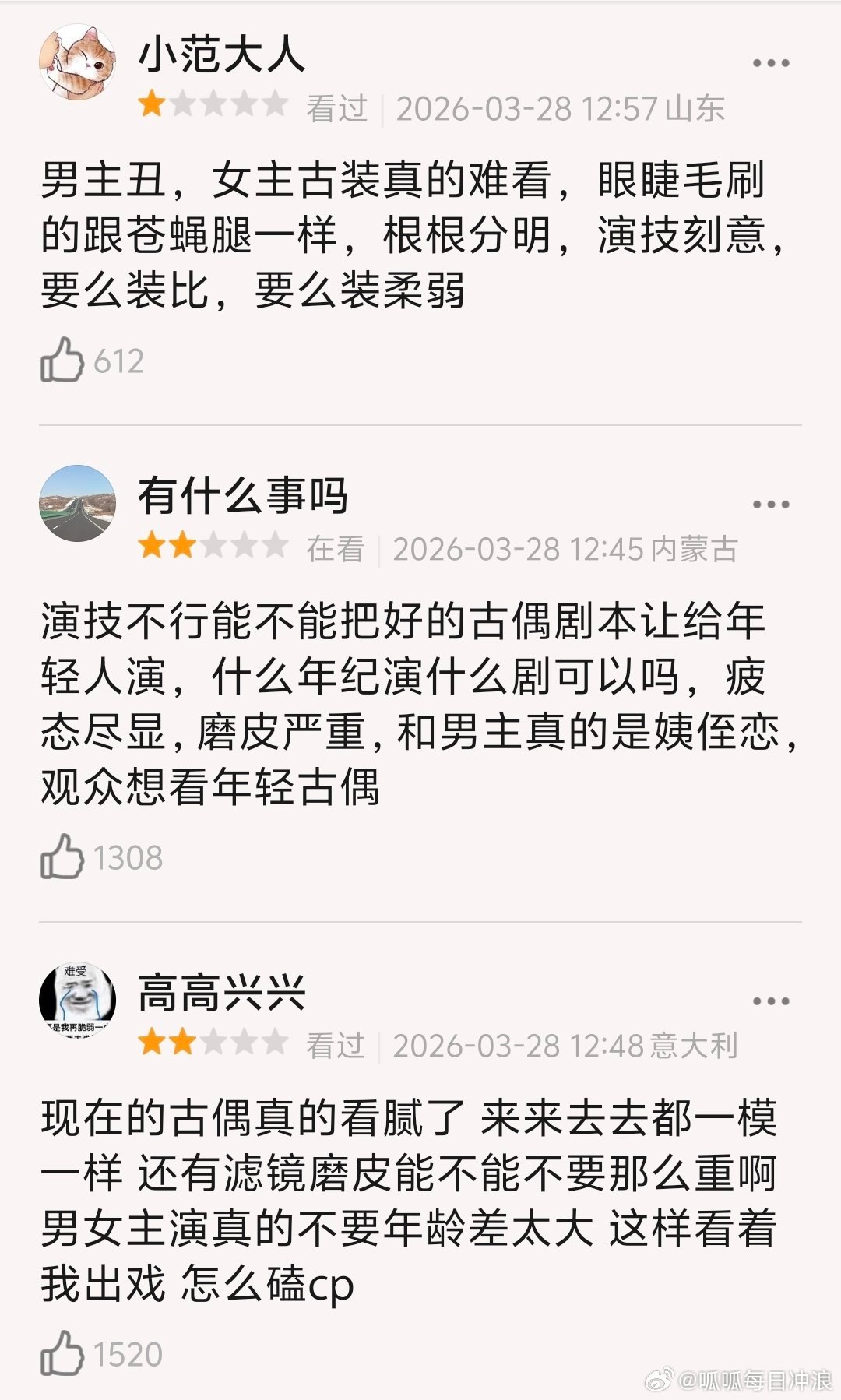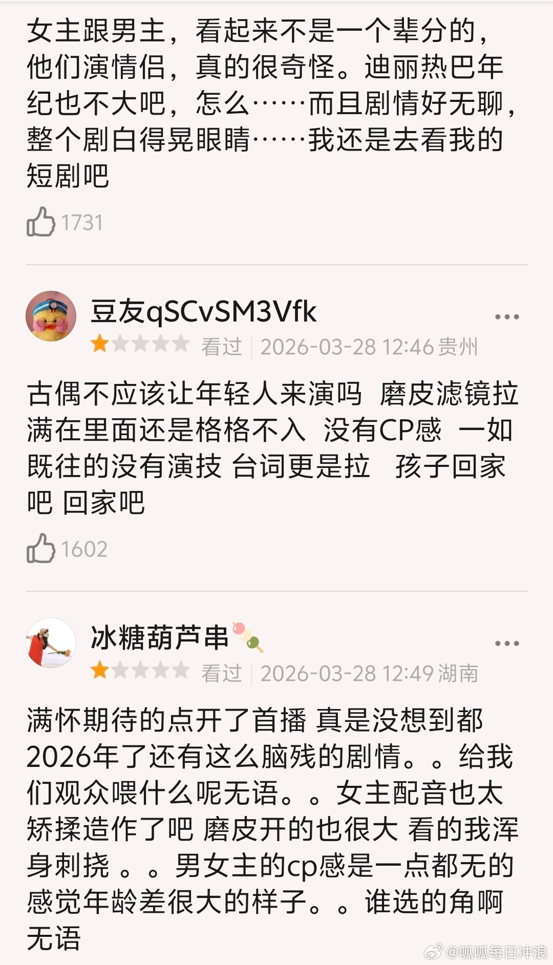 迪丽热巴、陈飞宇《白日提灯》开播,刚去豆瓣看了下,居然翻不到一个好评,全部都在说迪丽热巴陈飞宇显年龄差,没有cp感,演技退步。这一个小时这么多,是确实不好看还是有其他原因啊 流量的剧真的一播就是xfxy。