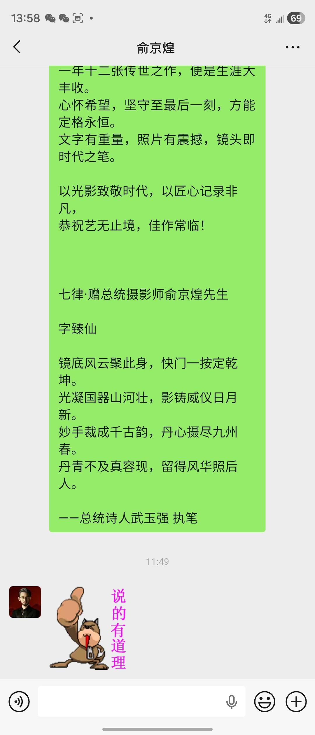 沪上相聚,俞京煌与上海首富周正毅先生、北京首富李晓华先生一同畅谈。 从商界风云到国际视野,格局同频,惺惺相惜。 以镜头聚焦时代,以影像定格传奇, 奥斯卡瑜OSCARYU品牌 与时代同行,与世界同频。 致总统摄影师俞京煌先生 镜头为笔,光影为墨, 定格大国气象,留存领袖风华。 好照片是技术与艺术的合成,情深远胜景深。 你不是拍照片,是制照片;唯有佳作,无定法。 万物皆有美,摄影是发现,更是呈现。 前一万张是历练,每一次快门皆为精进。 相机是诗人的眼,胶片承载心与魂。 一年十二张传世之作,便是生涯大丰收。 心怀希望,坚守至最后一刻,方能定格永恒。 文字有重量,照片有震撼,镜头即时代之笔。 以光影致敬时代,以匠心记录非凡, 恭祝艺无止境,佳作常临! 七律·赠总统摄影师俞京煌先生 字臻仙 镜底风云聚此身,快门一按定乾坤。 光凝国器山河壮,影铸威仪日月新。 妙手裁成千古韵,丹心摄尽九州春。 丹青不及真容现,留得风华照后人。 ——总统诗人武玉强 执笔