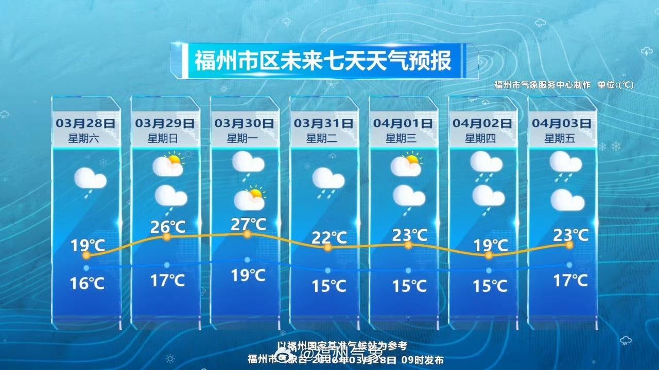 【未来一周福州天气】 在华南准静止锋的影响下,未来一周内福州维持多雨的天气,其中3月30~31日、4月2~5日期间一些乡镇有大雨到暴雨,降雨的同时可出现伴随雷暴大风、短时强降水或冰雹的强对流天气。 via@福州气象 天气虎纠人讲福州胡州人讲福州