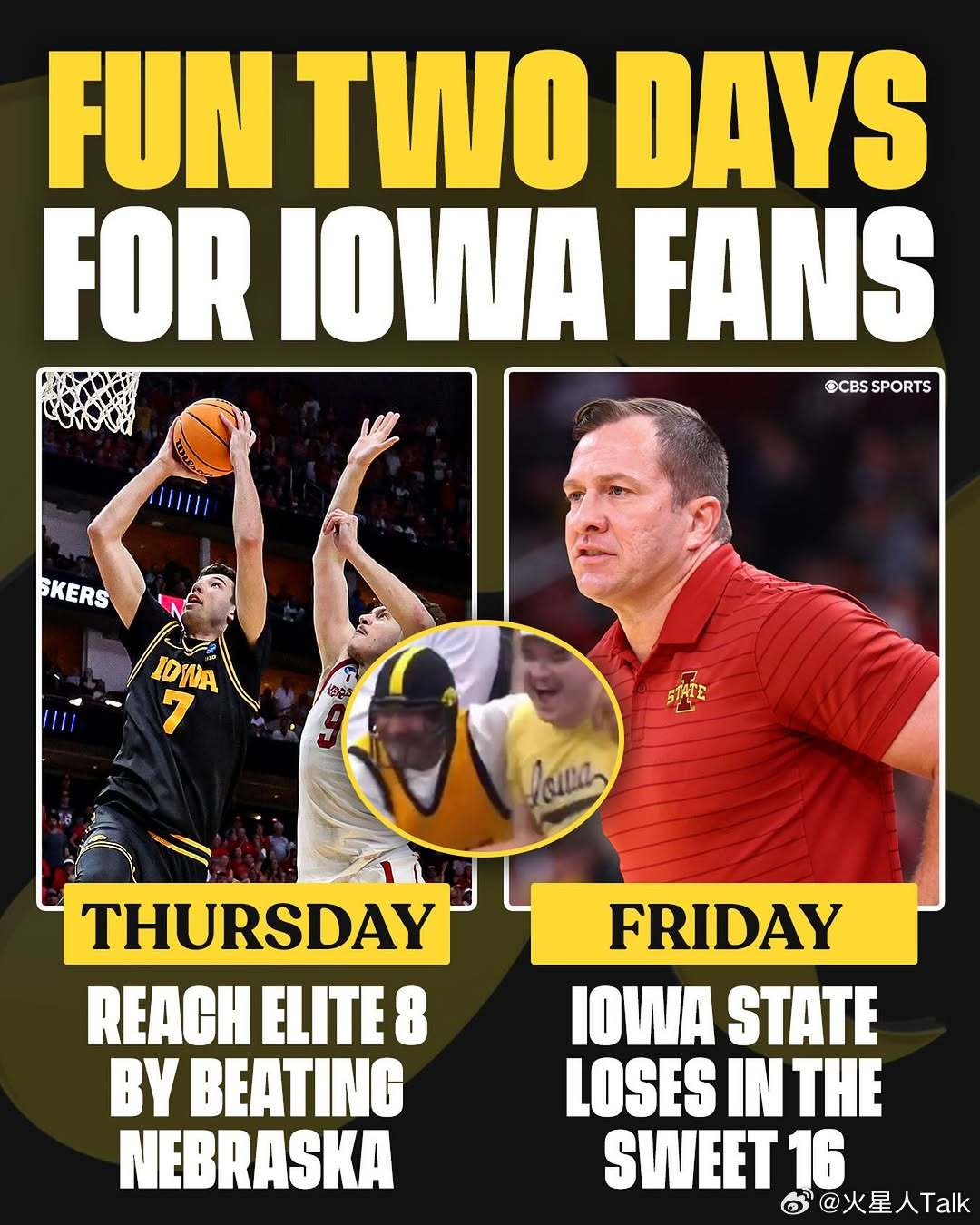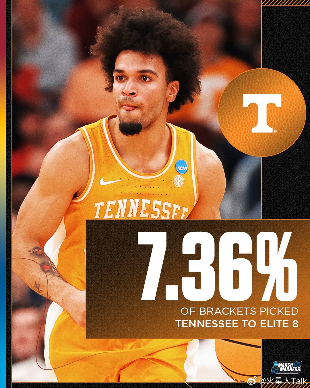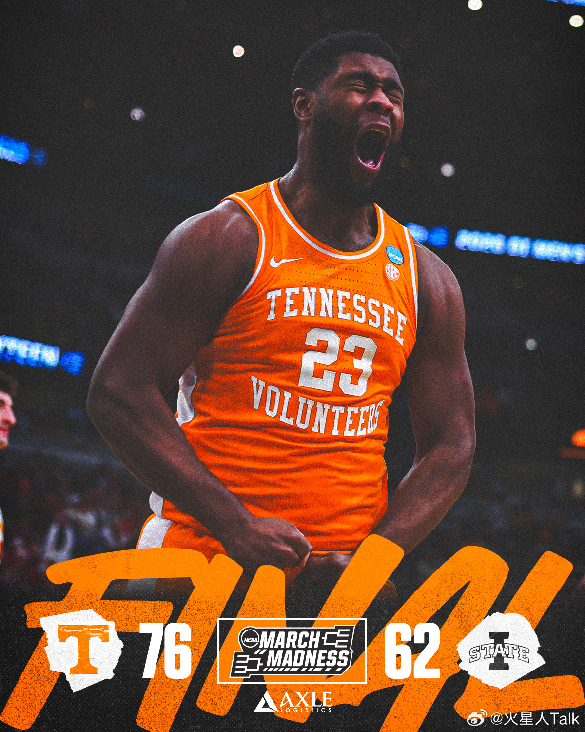 2025-2026赛季NCAA男篮疯狂三月 中西区田纳西大学击败爱荷华州立,连续三年进入精英八强。志愿者17个失误,篮板球领先21个。Nate Ament10中6,18分4篮板3助攻2失误2封盖。Felix Okpara6中5,12分10篮板3封盖。Jakobi Gillespie17中7,16分5失误。替补Jaylen Carey6中5,11分10篮板4助攻。Bishop Boswell3中1,4分8助攻。旋风投篮命中率不足30%,三分球命中率不足25%。Nate Heise12中5,18分5篮板。Tamin Lipsey13中6,18分5篮板5助攻3失误。Killyan Toure9中4,9分4篮板3助攻2抢断。Blake Buchanan3中3,8分2抢断。Joshua Jefferson因伤继续缺席。