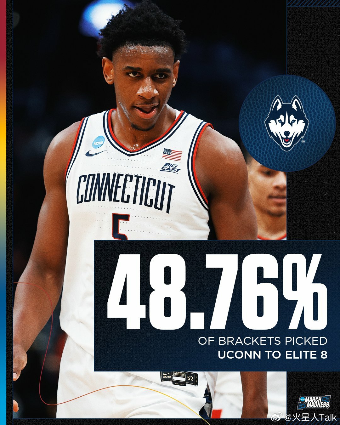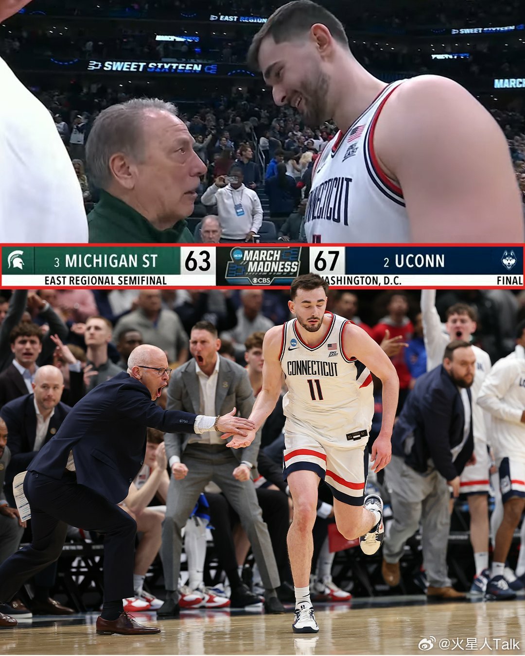 2025-2026赛季NCAA男篮疯狂三月 东区半决赛康涅狄格大学击败密歇根州立,开局8中6的三分球建立最大19分的领先优势。哈士奇Tarris Reed Jr16中8,20分5篮板4助攻2封盖。Alex Karaban12中6,17分7篮板3助攻2失误2封盖。Solo Ball8中4,12分。Braylon Mullins7中3,8分4篮板。斯巴达人开局三分球7中0。Carson Cooper8中5,14分7篮板3助攻2失误2封盖。Jeremy Fears Jr15中5,13分7助攻4失误3抢断。Jaxon Kohler10中4,12分8篮板2抢断。Coen Carr9中5,13分。