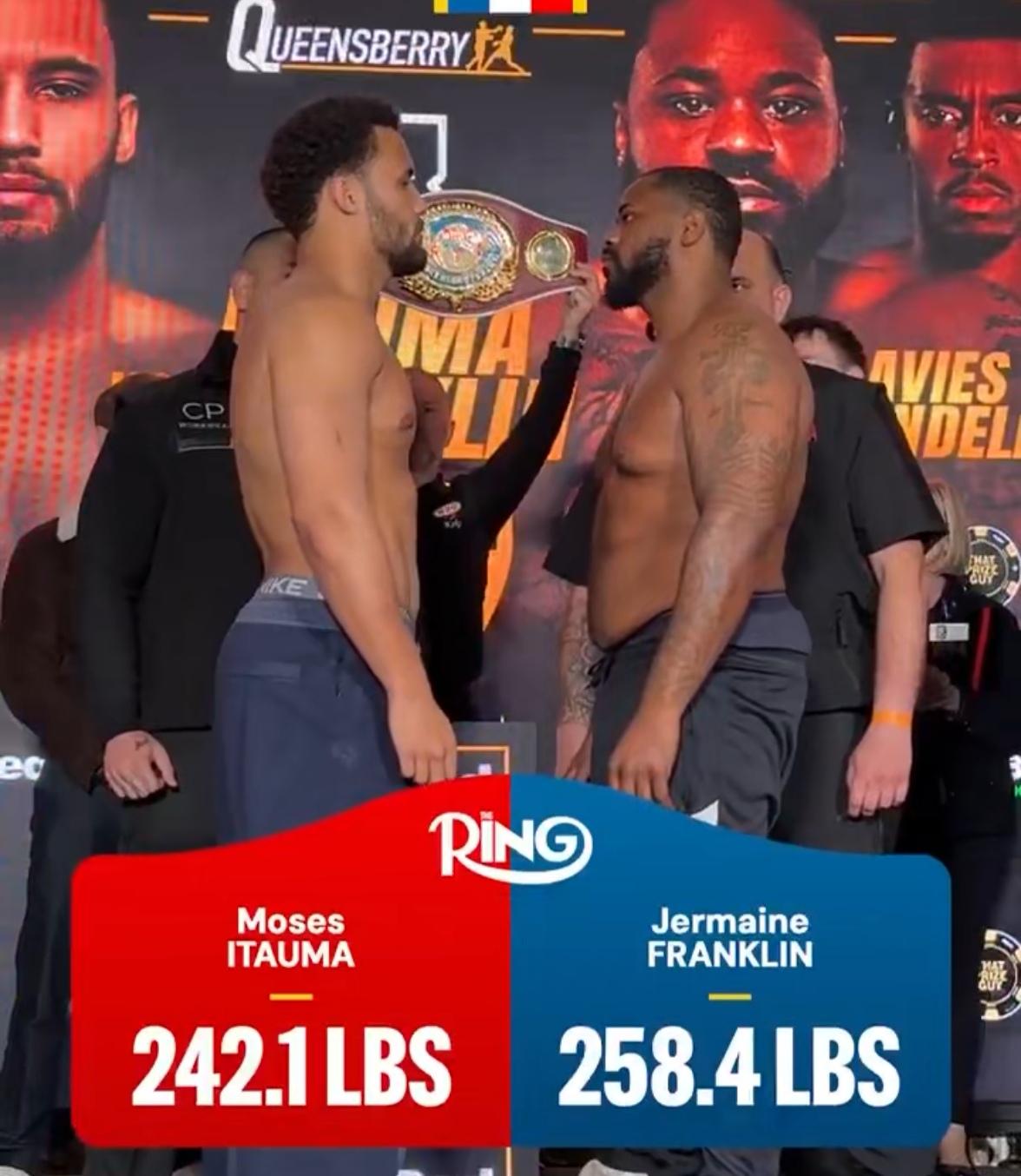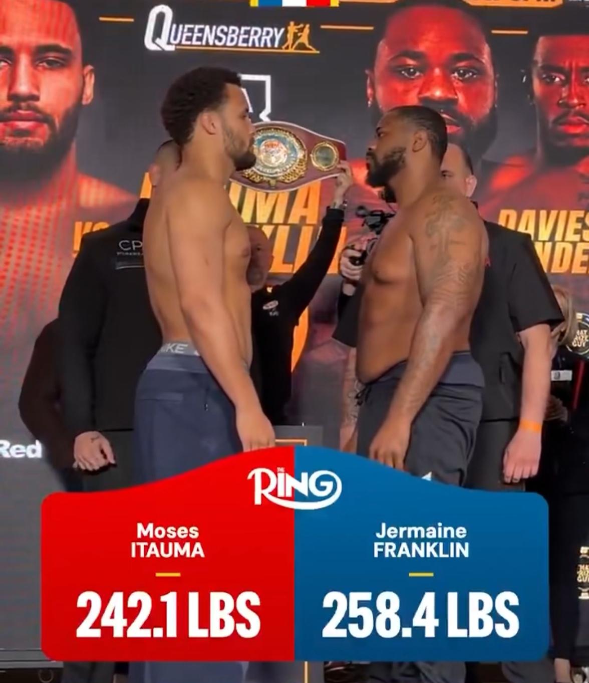 伊陶马VS富兰克林:WBO国际拳王赛,今天称重,明天开打,值得期待! 伊陶马(13战全胜11KO)VS富兰克林(24胜2败15KO):WBO重量级过渡拳王赛,今天早些时候已经称重,明天早上在英国开打,非常值得期待! 我的观点还是不变,看好伊陶马点数获胜,伊陶马想要KO富兰克林,还是有些难度的。同样的,富兰克林想要在英国赢伊陶马,难度一样非常大,21岁的伊陶马目前状态非常好!他上一场比赛快速KO了怀特(31胜4败21KO),就是很好的证明!而且伊陶马已经说了,他解决了富兰克林以后,马上要打WBC重量级过渡拳王卡巴耶尔(27战全胜19KO)!可谓信心十足,初生牛犊不怕虎! 对于明天的这场重量级大战,大家看好谁获胜呢?可以在评论区里留言说说看! 好的,谢谢收看!