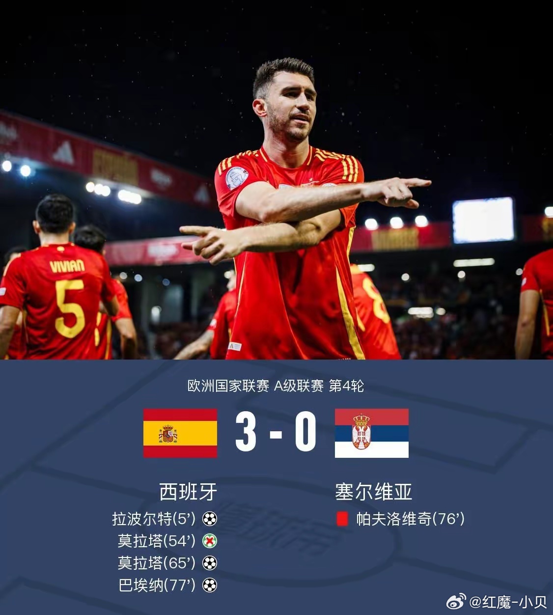 3-0!世界杯夺冠热门西班牙横扫塞尔维亚!北京时间3月28日凌晨,国际友谊赛中,西班牙实力碾压,以3-0轻松战胜塞尔维亚。上半场,奥亚萨瓦尔梅开二度,助球队2-0领先。下半场,维克托-穆尼奥斯再进一球,西班牙最终3-0获胜,祝贺!足球西班牙3比0塞尔维亚西班牙队