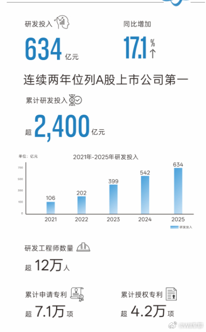 刚出炉的 2025 年财报汇总里,比亚迪的研发投入直接干到了 634 亿元,同比增长 17%,累计研发投入超 2400 亿元,相当于每天砸 1.74 亿搞技术,研发人员也达到了 12.77 万人。