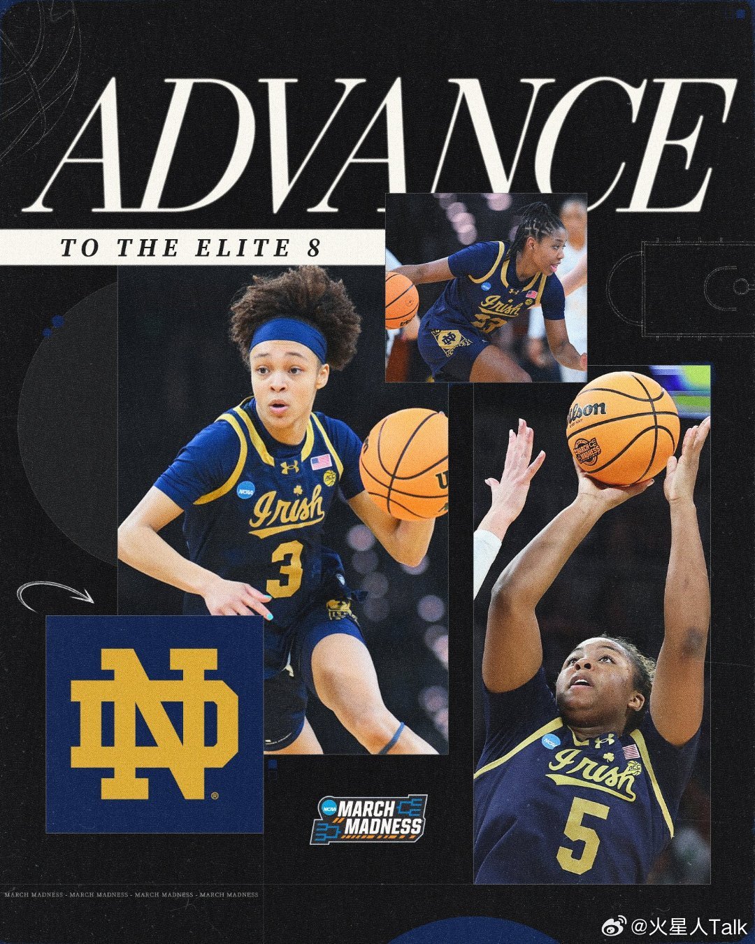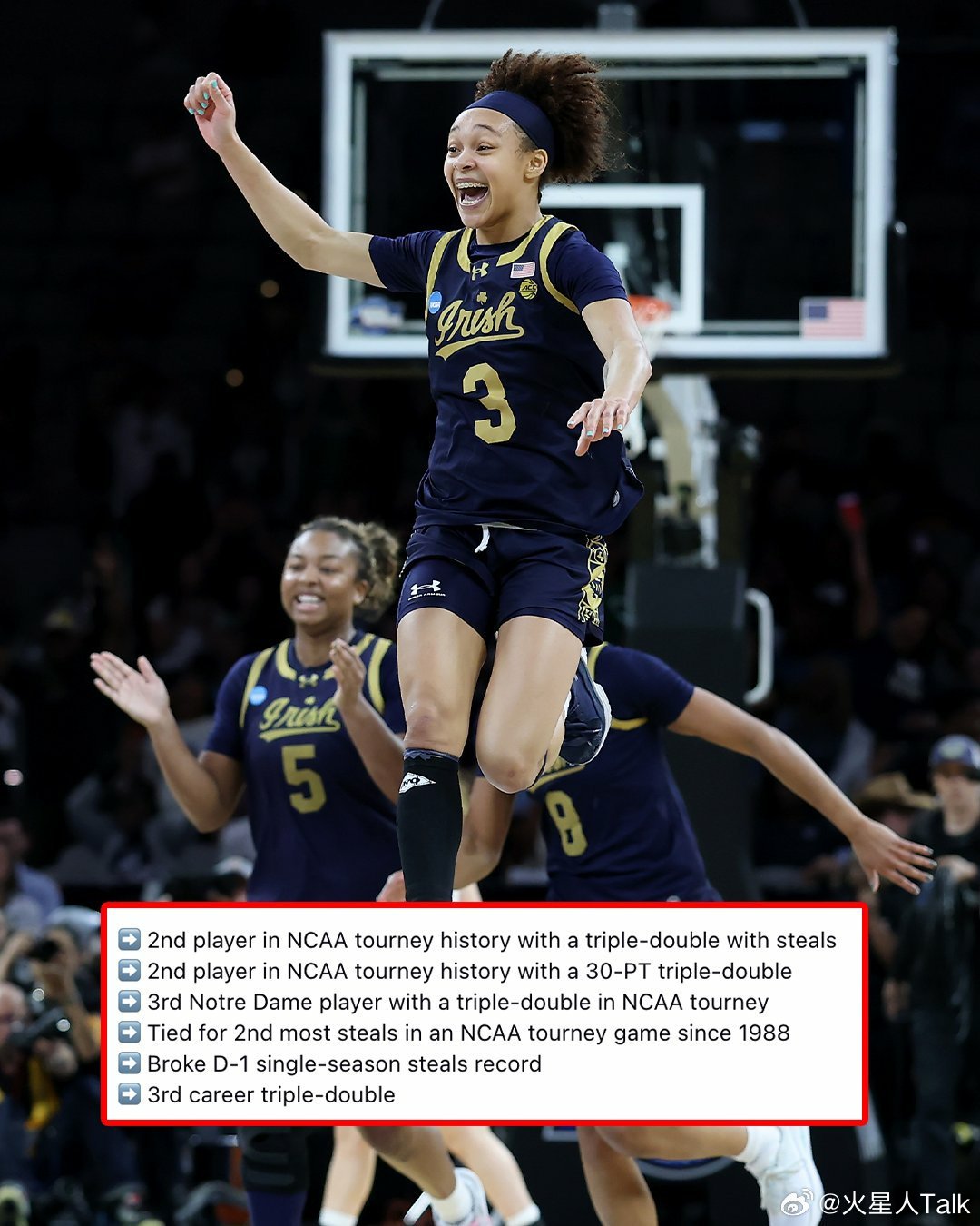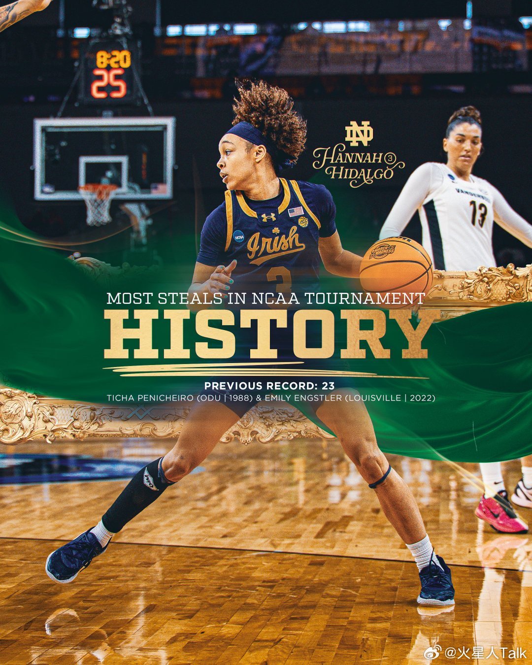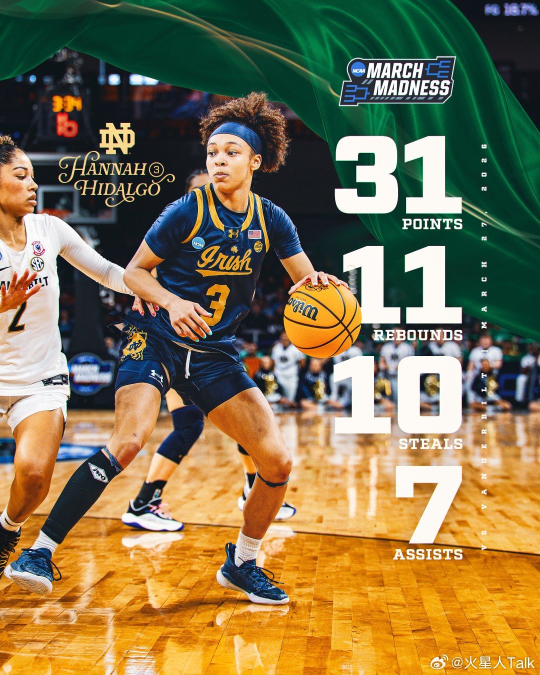 2025-2026赛季NCAA女篮疯狂三月 沃斯堡赛区(1)半决赛圣母大学击败范德比尔特大学,进入精英八强。爱尔兰人战士队Hannah Hidalgo25中14,31分11篮板10抢断7助攻3失误。仅三场比赛抢断已达到26个,创造疯三单赛季抢断纪录,此前纪录是23个(1988年的Ticha Penicheiro、2022年的Emily Engstler)。Cassandre Prosper13中5,15分5篮板。Malaya Cowles8之前4,8分4篮板2抢断。Iyana oore11中2,其中三分球8中0得到4分4助攻2抢断。海军准将自2009年首次进入16强,Mikayla Blakes26中7,26分8篮板3助攻2失误3抢断。Aubrey Galvan16中7,24分7篮板3助攻6失误。其他五位有出手的队友合计14分14失误。