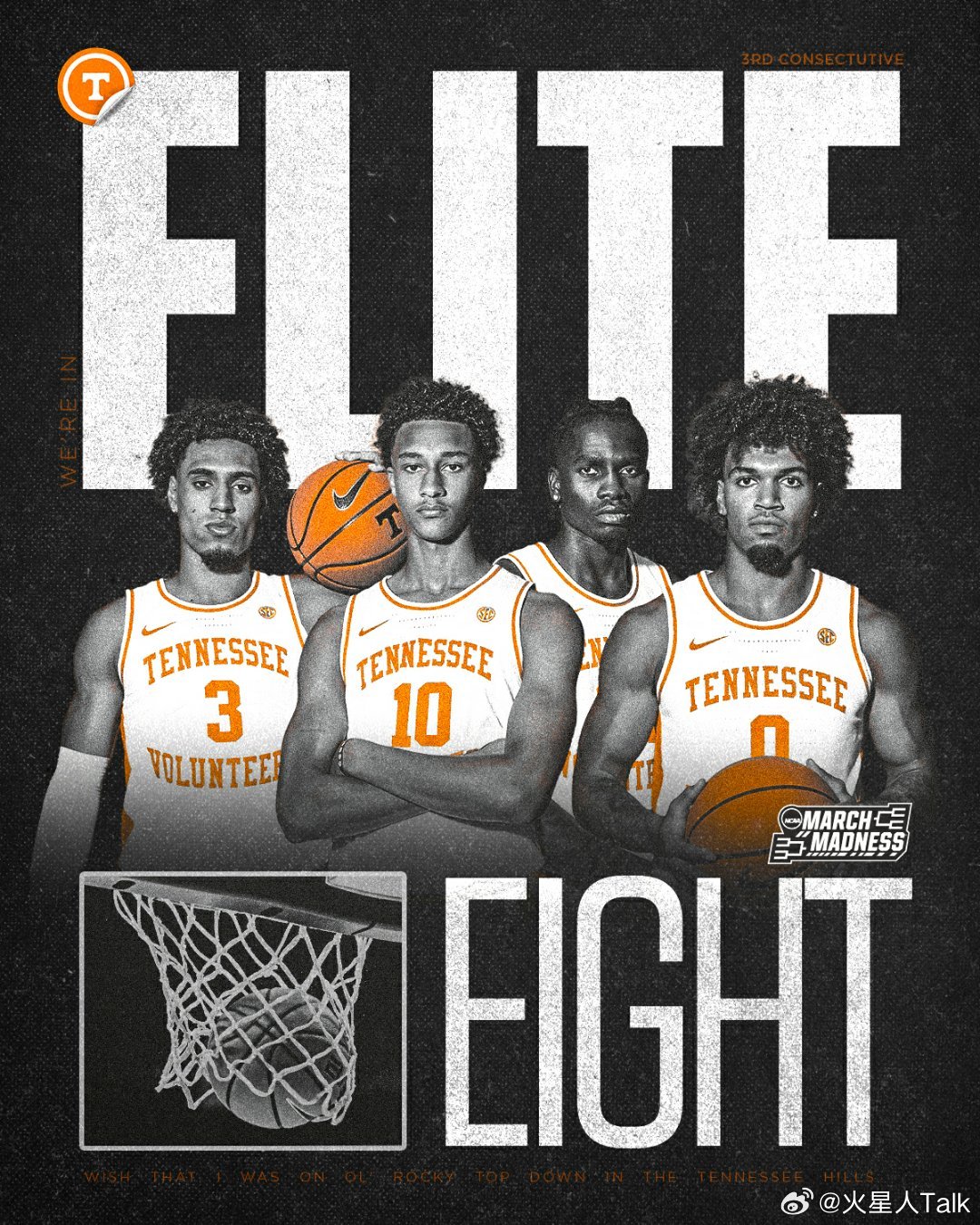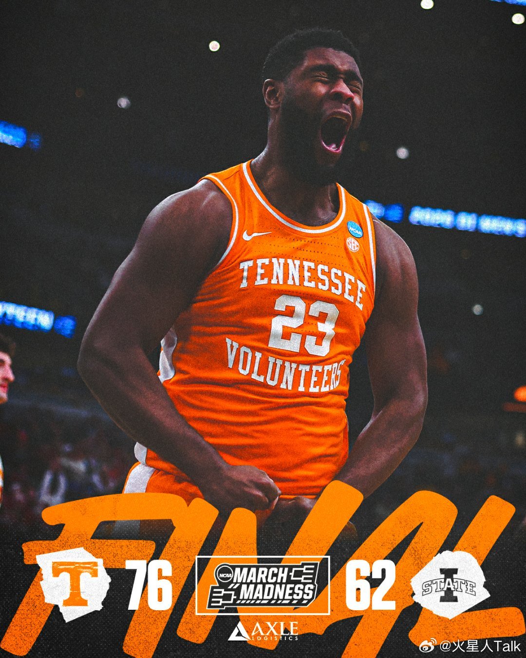 2025-2026赛季NCAA男篮疯狂三月 中西区半决赛田纳西大学击败爱荷华州立,连续三年进入精英八强。志愿者17个失误,篮板球领先21个。Nate Ament10中6,18分4篮板3助攻2失误2封盖。Felix Okpara6中5,12分10篮板3封盖。Jakobi Gillespie17中7,16分5失误。替补Jaylen Carey6中5,11分10篮板4助攻。Bishop Boswell3中1,4分8助攻。旋风投篮命中率不足30%,三分球命中率不足25%。Nate Heise12中5,18分5篮板。Tamin Lipsey13中6,18分5篮板5助攻3失误。Killyan Toure9中4,9分4篮板3助攻2抢断。Blake Buchanan3中3,8分2抢断。Joshua Jefferson因伤继续缺席。