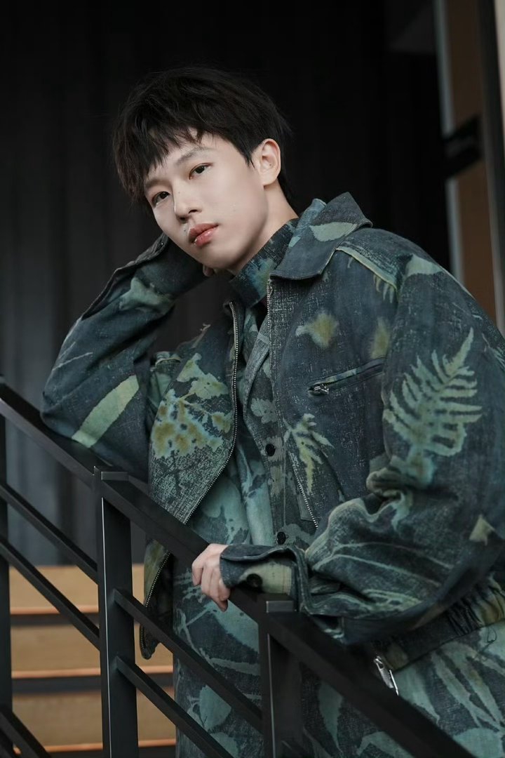 • 造型亮点:他身穿带有植物印花的迷彩工装外套,搭配黑色颈饰,在简约的楼梯间场景中,或慵懒倚靠、或沉静凝视,既有少年的清冽感,又藏着运动员特有的利落气场,被粉丝亲切称为「森林王子」。