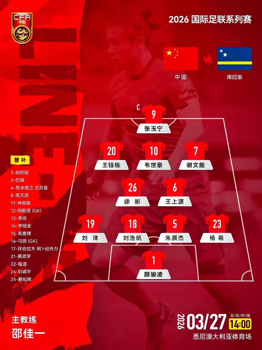 这场胜利实现三大目的 邵佳一指导带领新一届中国队,在与库拉索队的A级比赛中2-0拿下对手,世界排名积分又有了进账。 库拉索队,是一个十五六万人的荷属地,但却进入了2026世界杯,水平也是不低的。由于该国还是荷兰属地,很多球员都有在欧洲踢球的经历,水平不容小觑。 这一仗总体表现出乎意料,有了三大收获。 第一大收获。锋线球员能够攻城拔寨,主力前锋浮出水面。本场比赛首发前锋张玉宁和韦世豪各有一球入账。其中张玉宁还头球助攻韦世豪,完成一传一射。两人一高一快,有了默契度,构筑起了中国队第一道防守线。 第二大收获,战术渐露端倪。本场比赛,中国队控球率仅仅36%,相较于库拉索队差距还是很大,也就说基本处于防守状态,到了最后十分钟,邵佳一直接将阵型由442换成541,干脆做出全队防守的战术调整。 有了稳固的防守,才有了第一个反击进球。 过去被对手轻易攻破大门的场景不见了,防守有硬度,还有区域结合盯人防守,最后零封对手。 第三大收获,就是年轻人得到淬炼。邵佳一首发阵容安排了七老带四新(杨希、徐彬、刘浩帆、王钰栋)以老带新的阵容,后面通过四次换人,又派上吾米提江、蒯纪闻、刘诚宇、拜合拉木、胡荷韬五名U23球员。 整场比赛,邵佳一带来的十名U23球员,除了补招的李振全没有出场,其他球员都有了上场机会。 磨合阵容、遴选球员、演练战术,三大目的都已经达到。