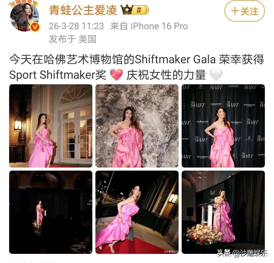 谷爱凌,传来喜讯! 3月28日,我们的“青蛙公主”谷爱凌又在社交平台甩出一则重磅喜讯,瞬间点燃全网! 这次不是在滑雪赛场上,而是在世界顶尖学府哈佛艺术博物馆的Shiftmaker Gala盛典上,她身着一条亮眼到不行的粉色抹胸长裙,优雅摘得“Sport Shiftmaker奖”。 看她晒出的六宫格现场美照,红毯上的她笑容明媚大气,颁奖台上鲜花簇拥,发表感言时从容自信,举手投足间尽显女性魅力。那个在雪道上腾空翻转的运动员,此刻化身为学术殿堂里闪闪发光的时尚icon。她在配文中难掩激动:“今天在哈佛艺术博物馆的Shiftmaker Gala荣幸获得Sport Shiftmaker奖,庆祝女性的力量。” 这次最让人惊艳的,莫过于谷爱凌一改往日运动风,选择了极具女性特质的粉色长裙。这波操作堪称教科书级别的“反差美学”——当所有人还在回味她冬奥会上的飒爽英姿时,她转身就以如此柔美的形象出现在学术殿堂。这种“可以强大,也可以柔美”的多面性,正是她给当代女性做出的最好示范。 她让世界看到:女性不需要被任何一种定义束缚,既能在赛场上驰骋风云,也能在红毯上优雅从容,更能站在学术舞台上分享思想。 可能有人会问:这到底是个什么奖?简单来说,Shiftmaker奖是为了表彰那些在各自领域推动变革、为社会带来积极影响的人。谷爱凌获奖,不仅仅因为她是奥运冠军,更因为她作为斯坦福学霸、时尚宠儿的多重身份,以及她对当代青少年无可比拟的正面影响力。 一个22岁的女孩,已经在体育、学术、时尚三个领域都达到了顶流水平,这种“开挂”的人生,确实值得一座这样的奖杯。 客观来说,谷爱凌这次获奖本身无可厚非。她确实在多个领域都做到了顶尖,用自己的实际行动诠释了“女性可以有多面性”。但网友的质疑也并非全无道理——当一个人的获奖频率过高,难免会引发“奖项通胀”的讨论。 更深层次看,大家对谷爱凌的争议,其实折射出一个问题:我们到底该如何看待“跨界偶像”?一方面我们希望榜样无所不能,另一方面又本能地怀疑“全能”的真实性。 但无论如何,一个22岁的女孩能在学业、运动、时尚、公益多个领域都交出亮眼答卷,本身就值得肯定。 期待谷爱凌继续用自己的方式,给我们带来更多惊喜——无论是在赛场上,还是在更广阔的人生舞台上。