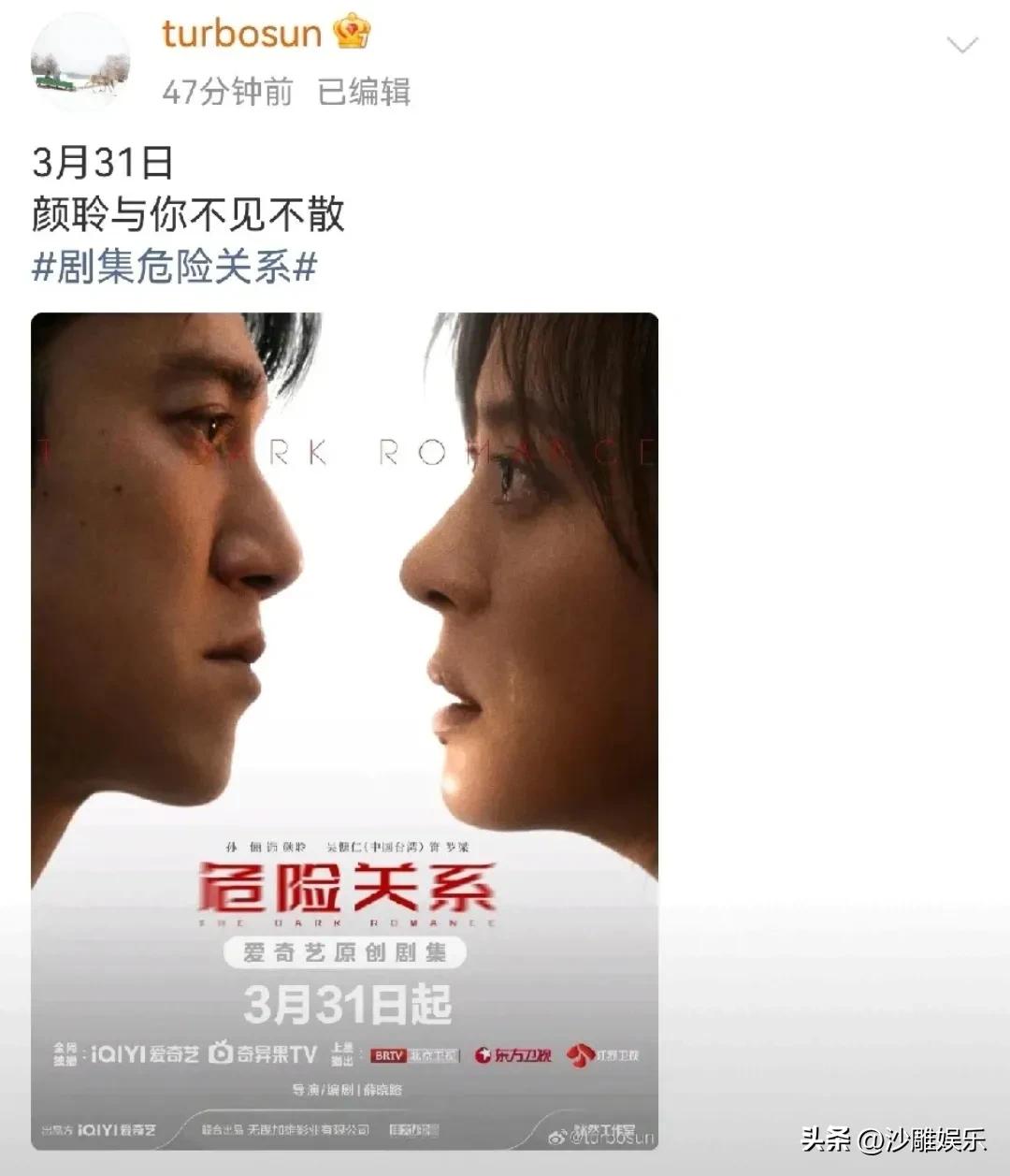 孙俪,激动发文! 3月28日中午,一向低调到近乎“神隐”的孙俪,突然在社交平台高调发文,不仅罕见地给自己打起了广告,还撂下一句狠话:3天后,不见不散! 这画风突变得让粉丝都有点不适应——要知道,这可是孙俪啊!那个一年只拍一部戏、微博除了泡脚就是练字的“养生娘娘”。能让这位姐亲自下场吆喝的,到底是什么大阵仗? 原来,孙俪的新剧 《危险关系》 正式定档3月31日了!而且排面拉满,东方、北京、江苏三大卫视黄金档联播,爱奇艺同步上线。这阵仗,妥妥的“神仙下凡”! 比新剧定档更有意思的,是评论区里的“甄嬛传售后”。 孙俪前脚刚发完博,后脚评论区就被“安陵容”陶昕然攻占了。陶昕然激动留言:“不管我是在空中吊着还是在陆地上我都会看的,小板凳准备好,伙伴们都要去看呀! ” 这话一出,懂的都懂!这梗得从最近《乘风2026》说起。在节目连麦环节,陶昕然给孙俪打电话请教初舞台建议,孙俪脑洞大开,直接建议她复刻安陵容的“冰嬉舞”,还“贴心”支招:“让他们把你吊起来,一边飞一边跳。 ” 好家伙,戏里甄嬛和安陵容是渐行渐远的塑料姐妹花,戏外却是15年如一日的真闺蜜。孙俪随口一句玩笑话,陶昕然转头就拿来给姐姐的新剧打call。网友直接破防:“这才是真·双向奔赴!我的甄嬛和安陵容是真的! ” 玩笑归玩笑,这部剧本身,才是一颗真正的“深水炸弹”。 导演薛晓路,就是当年拍出国产家暴剧天花板 《不要和陌生人说话》的编剧。时隔二十年,她这次把镜头对准了更隐蔽、更窒息的亲密关系——情感操控。 孙俪这次彻底撕掉了“大女主”标签。她饰演的颜聆,不是甄嬛那种“谁惹我我灭谁”的狠人,而是一个被“温水煮青蛙”式消耗的高知女性。从清醒独立到一步步陷入精神控制的深渊,海报里她眼神里那种破碎感,光是看一眼就让人提前揪心。 而跟她演对手戏的,是金马影帝吴慷仁。他演的是一个表面温柔儒雅的精神科医生,实则是个阴鸷的PUA老手,用爱意铸造囚笼,把伴侣玩弄于股掌之间。 网友辣评:“让孙俪演被PUA?她那张脸看起来像是会把PUA她的男人送进监狱的!” 但恰恰是这种反差,才让人更期待——当一个原本强大的女性被摧毁时,那种绝望和挣扎,才更具冲击力。 3月31日,这场关于爱与控制的战争就要打响。你会期待孙俪的表演吗?