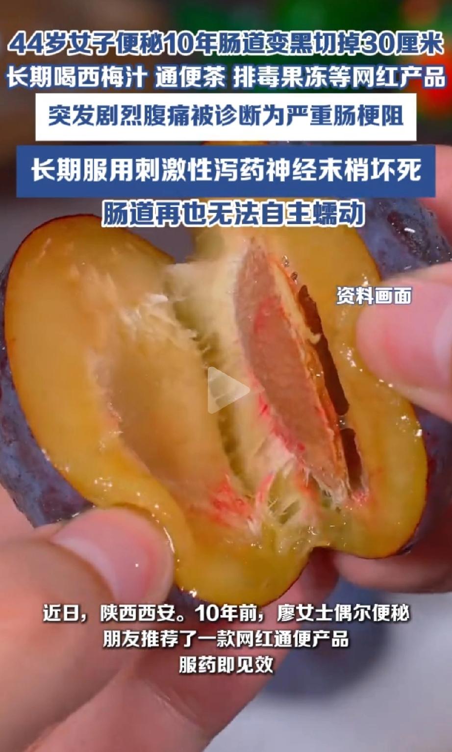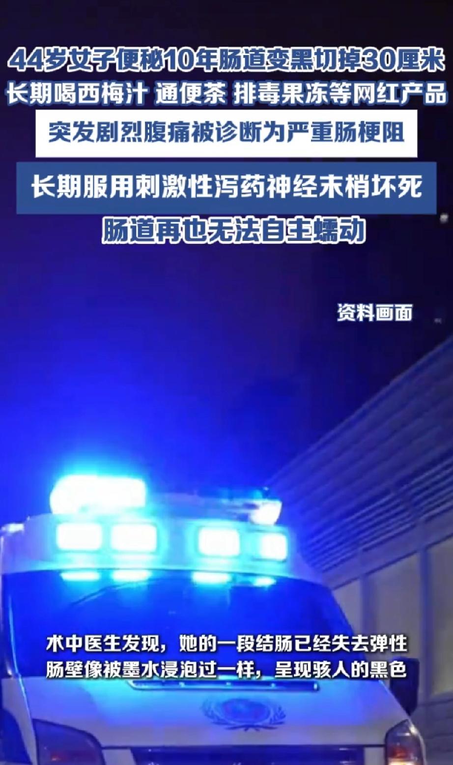 西安,44岁的廖女士被便秘折磨了整整10年,长期吃各种网红通便产品,像通便茶、胶囊、果冻、西梅汁这些,一开始确实管用,可停药就反弹,便秘反而更严重。最后不得不切掉她30厘米的病变肠管,这才保住了命 。 廖女士的便秘史一开始只是偶尔排便不畅,她没去看医生,就跟着网上推荐买了些网红通便产品。 刚开始吃效果特别好,她以为找到了救星,可一停药,便秘就比以前更厉害,拉不出屎的滋味太难受了,她只能又开始吃,而且越吃越多 。 就这样,她对泻药的依赖越来越深,从一天一次变成一天好几次,剂量也加了好几倍。 这些泻药就像鞭子一样,不停地抽打她的肠道,强迫它蠕动排便。 她的肠道慢慢失去了自己工作的能力,变成了一个只能靠药物驱动的“机器”。 直到最近,她突然肚子疼得直打滚,连续5天,别说拉屎了,连气都排不出来。 家人赶紧送她去医院,医生检查后说,她的肠道已经严重梗阻,里面堵得严严实实。 打开肚子一看,肠子不仅变黑了,神经末梢也都坏死了,根本动不了,只能切掉那段坏了的30厘米肠管 。 有网友说:“那些网红产品真坑人,宣传的时候只说效果好,绝口不提副作用!” “为啥不早点去医院?非要等到切肠子才后悔吗?” 廖女士的遭遇不是个例,现在很多人都有便秘的困扰,一难受就想找捷径,网上那些“排宿便”“清肠毒”的产品,吹得天花乱坠,把泻药包装成“养生神器”,其实就是在害人! 这些网红泻药大多含有蒽醌类成分,像大黄、番泻叶这些,短期用确实能拉,但长期吃会让你的肠子变黑,医学上叫“结肠黑变病”,就像蛇皮一样,特别吓人。 更可怕的是,它会杀死肠道里的神经,让肠道彻底失去蠕动能力,最后变成“泻药依赖”,不吃药就根本拉不出,越吃越堵,形成恶性循环 ! 那些商家为了赚钱,根本不管你的健康,把泻药包装成“天然草本”“无副作用”,骗你花钱买罪受。 而我们自己呢?身体不舒服了,第一反应不是去看医生,而是自己瞎买药吃,这才是最危险的! 便秘不是小毛病,但泻药绝对不是正确的解决方案! 我们的身体是台精密的机器,肠道就像传送带,它有自己的节奏和动力。 泻药就像强行加速的按钮,偶尔按一下可能没事,天天按,机器早晚要坏。 真正解决便秘的办法,从来都不是吃药,而是: 1. 多吃蔬菜、水果、粗粮,这些食物里的膳食纤维才是肠道真正的“燃料”,能让大便变软,容易排出; 2. 每天喝够1.5-2升温水,别用奶茶、饮料代替,水是软化大便的关键; 3. 规律运动,每天走走路、跑跑步,运动能直接刺激肠道蠕动,比什么药都管用; 4. 定时排便,每天早上起床或者吃完饭后,试着去厕所蹲几分钟,养成习惯; 5. 最重要的:如果便秘超过3天,或者伴有腹痛、便血,一定要去看医生,别自己瞎折腾! 健康没有捷径,别再相信那些“网红神器”的鬼话,别让你的肠子,变成下一个被切掉的“黑肠子”。转发给你身边爱买通便产品的家人朋友,让更多人知道这个可怕的真相!